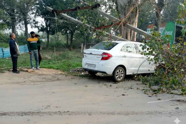 अनियंत्रित कार बिजली खंभों से टकराई, दो घायल, बिजली आपूर्ति बाधित