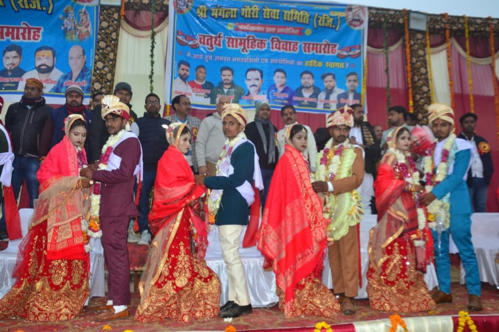फर्रुखाबाद, समृद्धि न्यूज। श्री मंगला गौरी सेवा समिति द्वारा आयोजित चतुर्थ सामूहिक विवाह समारोह का आयोजन गुरुगांव देवी मंदिर में धूमधाम से आयोजित किया गया। जिसमें 14 जोड़ों ने एक दूसरे को वरमाला पहनाकर अपने दामपत्य जीवन की शुरुआत की। गणमान्य नागरिकों द्वारा वर-वधुओं को उनके सुखद दामपत्य जीवन एवं उज्जवल भविष्य के लिए आशीर्वाद प्रदान किया गया। सामूहिक निकली बारात देखने के लिए लोगों की भीड़ लगी रही।