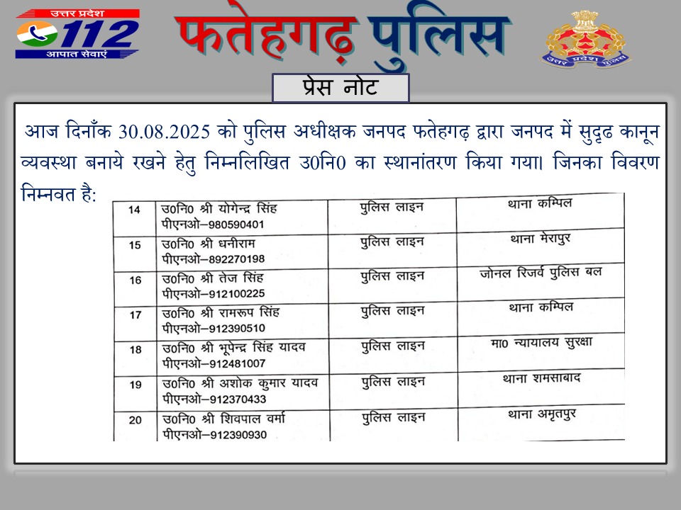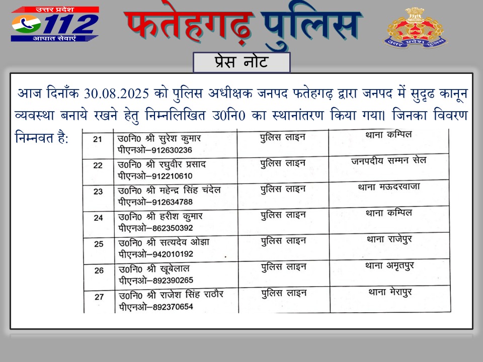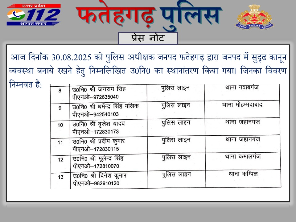 पुलिस लाइन से स्थानांतरण उपनिरीक्षकों के नाम इस प्रकार:- उपनिरीक्षक कल्लू प्रसाद यादव को थाना कमालगंज, उपनिरीक्षक सुरेश कुमार को थाना थाना अमृतपुर, उपनिरीक्षक अब्दुल खालिक को थाना मऊदरवाजा, उपनिरीक्षक मुकेश कुमार बाजपेयी को थाना फतेहगढ़, उपनिरीक्षक राकेश सिंह को थाना शमशाबाद, उपनिरीक्षक जसवीर सिंह को थाना शमशाबाद, उपनिरीक्षक पंकज कुमार यादव को थाना मऊदरवाजा, उपनिरीक्षक जगराम सिंह को थाना नवाबगंज,