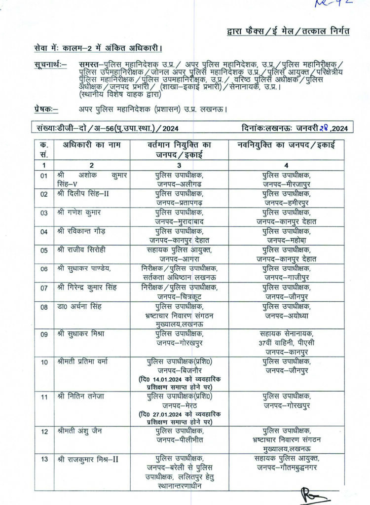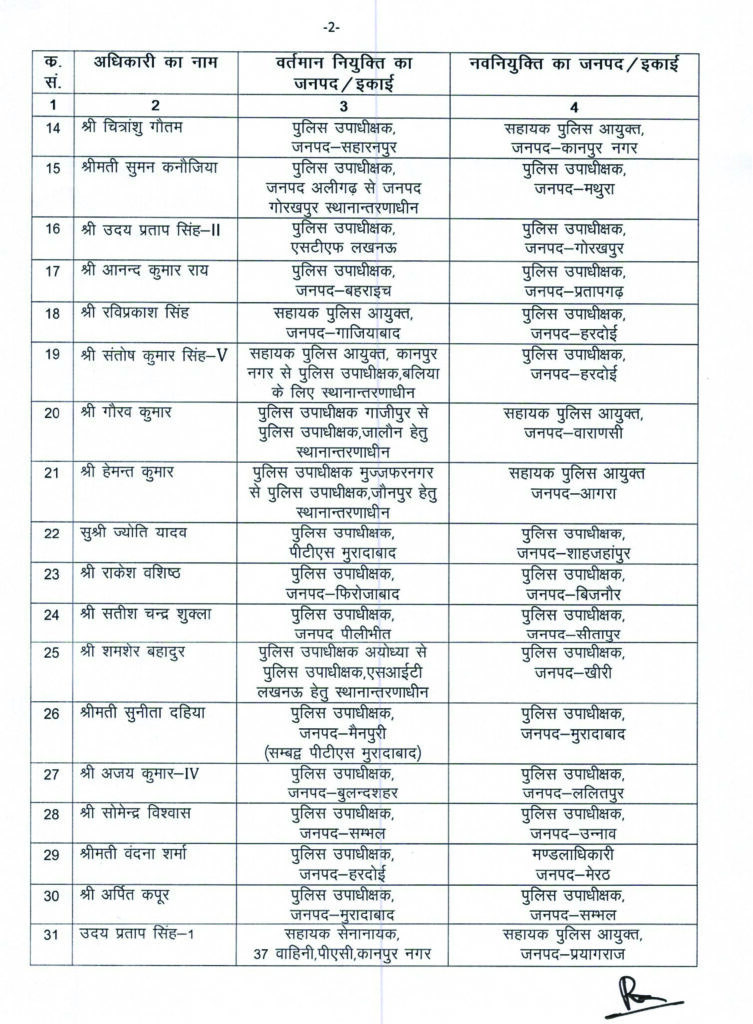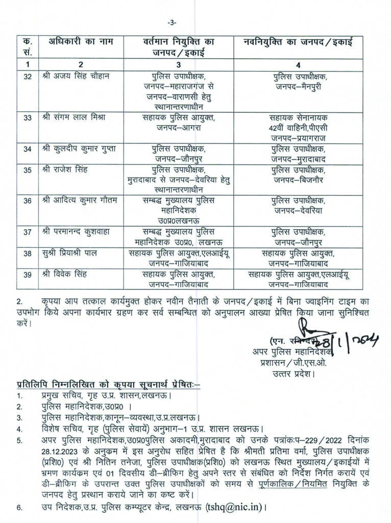 समृद्धि न्यूज। अपर पुलिस महानिदेशक प्रशासन/जी.एस.ओ. उत्तर प्रदेश एन. रविन्दर ने 39 कालम-2 के अधिकारियों के तबादला सूची जारी करते हुए सभी को तत्काल कार्य मुक्त होकर नवीन तैनाती के जनपद/इकाई में बिना ज्वाइनिंग टाइम का उपयोग किये अपना कार्यभार ग्रहण कर संबंधित को आख्या प्रेषित करें।