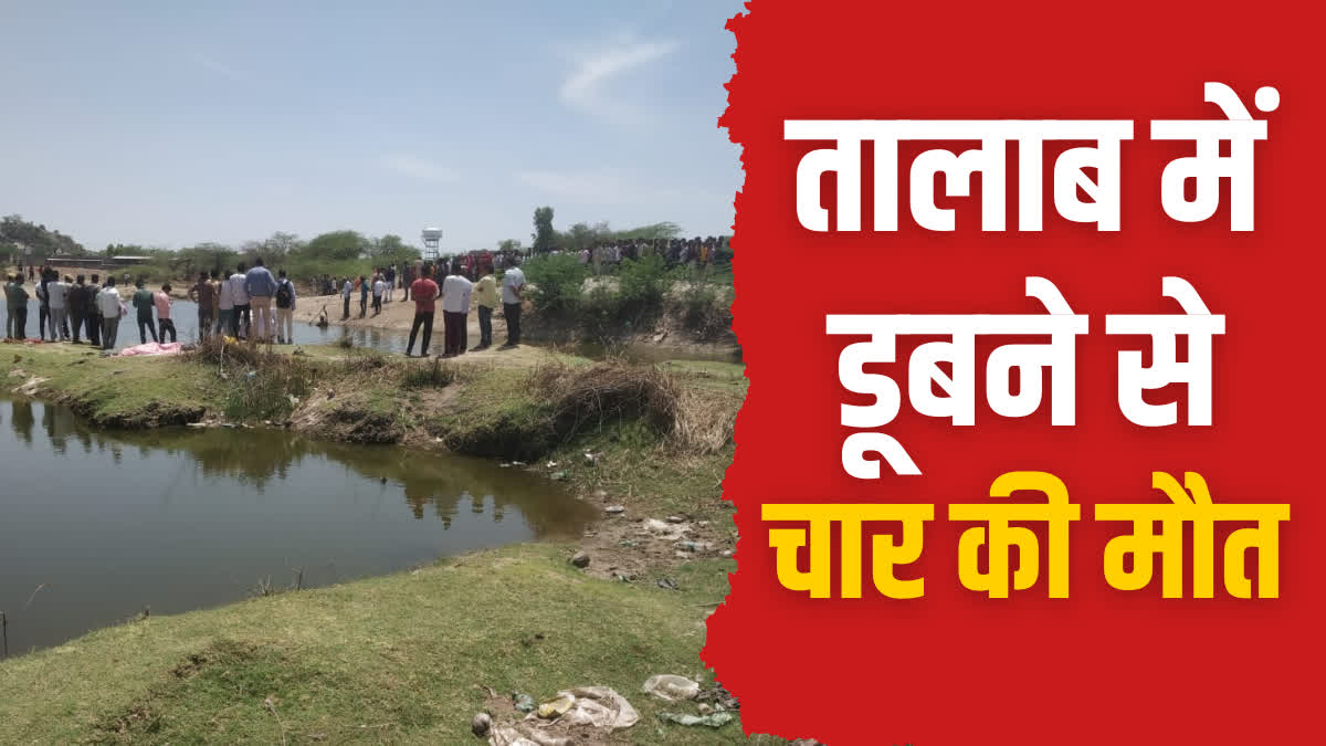 चार लोगों को तालाब में डूबने की खबर मिलने के बाद तालाब के पास जुटे स्थानीय लोग. Pali Accident: राजस्थान के पाली जिले में एक बड़ा हादसा हो गया है. यहां तालाब में मछली पकड़ने गए एक ही परिवार के 4 सदस्यों की डूबने से मौत हो गई है. मिली जानकारी के अनुसार यह घटना जिले के नाणा थाना क्षेत्र के चामुंडेरी गांव की है.