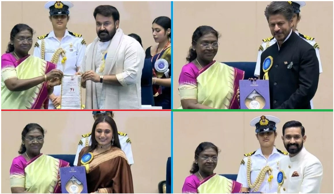 नई दिल्ली: दिल्ली के विज्ञान भवन में 23 सितंबर को राष्ट्रीय फिल्म पुरस्कार समारोह का आयोजन हुआ। जहां सिनेमा में योगदान के लिए अलग-अलग केटेगरी में कई सितारों को सम्मानित किया गया। जवान, एनिमल, रॉकी और रानी की प्रेम कहानी, समेत और भी कई बड़ी फिल्मों ने अवॉर्ड जीते हैं। 2023 में रिलीज हुई फल्मों के लिए 71वें नेशनल फिल्म अवॉर्ड से विनर्स को सम्मानित किया गया। इस दौरान सालों से हिंदी सिनेमा में अपने टैलेंट से दर्शकों का मनोरंजन करने वाले शाहरुख खान और रानी मुखर्जी ने अपना पहला नेशनल अवॉर्ड जीता। वहीं मोहनलाल को दादासाहेब फाल्के अवॉर्ड से सम्मानित किया गया। फिल्म 12वीं फेल को बेस्ट फिल्म चुना गया है। इस फिल्म में लीड रोल निभाने वाले विक्रांत मैसी को बेस्ट एक्टर का पुरस्कार मिला। इसी तरह, शाहरुख खान को एटली निर्देशित फिल्म जवान में उनकी भूमिका के लिए अपना पहला राष्ट्रीय पुरस्कार मिला। मलयालम एक्टर मोहनलाल को भारतीय सिनेमा के सर्वोच्च सम्मान दादा साहब फाल्के पुरस्कार से सम्मानित किया गया। कार्यक्रम का समापन करते हुए महामहिम द्रौपदी मुर्मू ने संबोधन किया। उन्होंने दादासाहेब फाल्के अवॉर्ड जीतने वाले अभिनेता मोहनलाल को बधाई देते हुए उनकी तारीफ की। उन्होंने मोहनलाल की फिल्मों की भी सराहना की। इस दौरान राष्ट्रपति मुर्मू ने सिनेमा में महिलाओं की बढ़ती सक्रियता और महिला आधारित फिल्मों के निर्माण पर भी खुशी जताई।