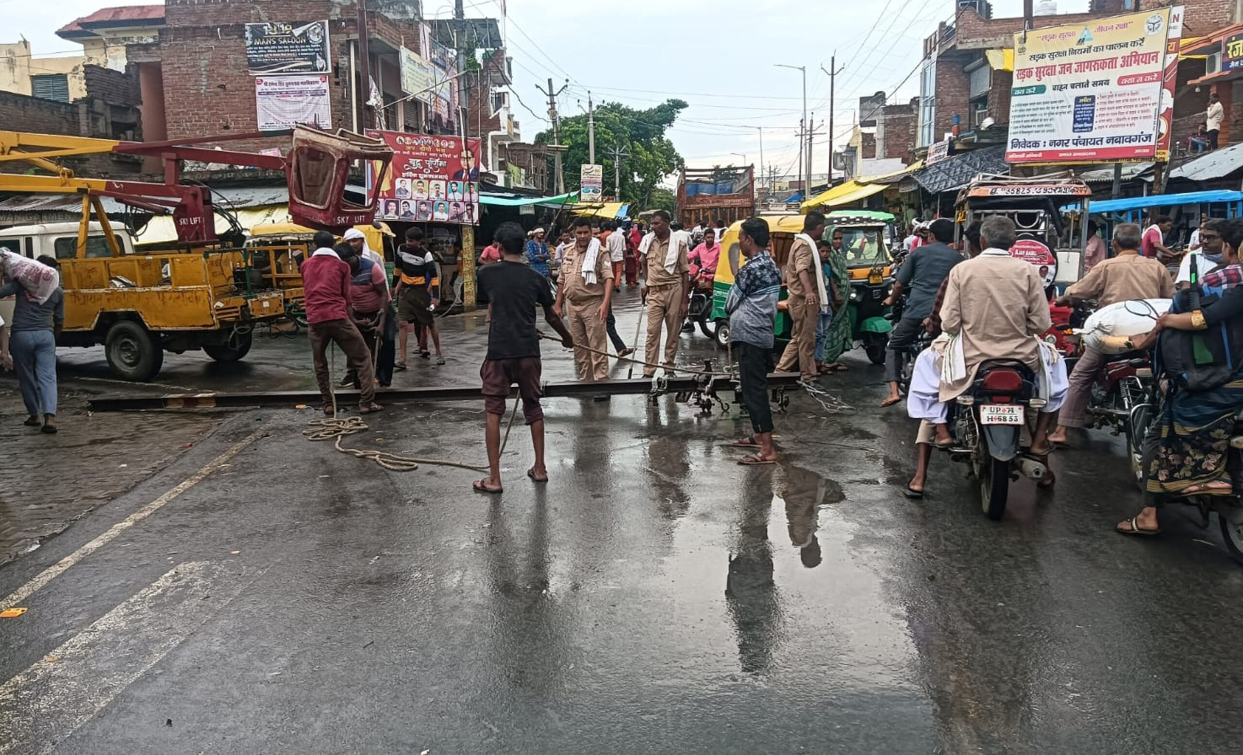 जानकारी के अनुसार कस्बा नवाबगंज चौराहे पर दसियों वर्ष पुराना लोहे का विद्युत पोल खड़ा था जो की काफी नीचे से गल चुका था, लेकिन विद्युत विभाग के कर्मचारी मामले की अनदेखी करते रहे। आज भारी बारिश होने के कारण विद्युत पोल टूटकर गिर गया, लेकिन चारों तरफ से लाइन खिंची होने के कारण पोल नीचे नहीं गिरा, जिससे एक बड़ा हादसा टल गया, क्योंकि चौराहे पर सैकड़ों की संख्या में लोगों का आना जाना हर समय रहता है। घटना की सूचना मौजूद लोगों ने विद्युत उप केंद्र पर दी। सूचना पाते ही एकदम बिजली की लाइन काट दी गयी और नगर पंचायत की बिजली संभालने वाली क्रेन गाड़ी कर्मचारियों के साथ मौके पर पहुंची। वहीं विद्युत उपकेंद्र से विद्युत कर्मचारी भी तुरंत पहुंचे और चारों तरफ की लाइन खोली तथा सूचना पुलिस को दी। थाना पुलिस मौके पर पहुंची। थाना पुलिस ने आवागमन को बंद कराया। तब विद्युत विभाग के कर्मचारियों ने दोनों तरफ से लाइन खोली और खंबा नीचे गिराया। विद्युत विभाग के कर्मचारी तथा नगर पंचायत के कर्मचारी बिजली व्यवस्था सुधारने में लगे थे।