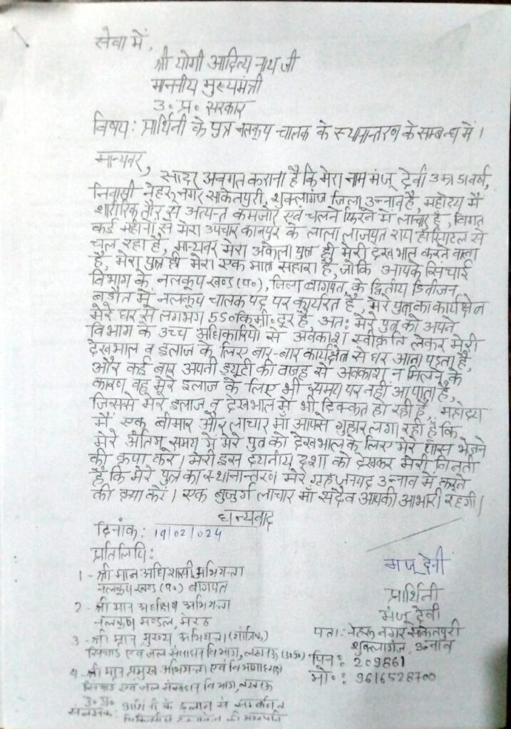 जनपद उन्नाव के शुक्लागंज नेहरू नगर सकेटपुरी निवासी पीड़िता मंजू देवी ने मुख्यमंत्री को भेजे प्रार्थना पत्र में दर्शाया कि मैं शारीरिक रुप से बहुत कमजोर हूं, और चलने फिरने में लाचार हूं। मेरा कानपुर स्थित एक अस्पताल से इलाज चल रहा है। मेरी देखभाल करने वालो मेरा इकलौता पुत्र है। वह सिंचाई विभाग के नलकूप खण्ड (प0) जिला बागपत के द्वितीय डिविजन बड़ौत में नलकूप चालक पद पर कार्यरत है। वह देखभाल के लिए समय पर नहीं आ पाता है।बीमार और लाचार मां ने गुहार लगायी है कि अंतिम समय में मेरे पुत्र को देखभाल के लिए मेरे पास भेजने की कृपा करें। मेरी दयनीय दशा देखकर मेरे गृह जनपद उन्नाव में स्थानांतरण कर दिया जाये।