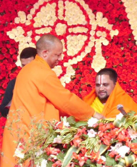 उदार चरित्र वाले संपूर्ण पृथ्वी को अपना कुटुंब मानते हैं और यह उदार भावना सनातन हिंदू संस्कृति में है।मुख्यमंत्री ने कहा कि आज हिंदू समाज को सनातन संस्कृति की रक्षा के लिए जागृत होना पड़ेगा।जागरण का ही परिणाम है की पांच सौ साल की पुरानी दास्तां के पश्चात प्रभु श्रीराम दिव्य और भव्य रूप से अयोध्या में विराजे हैं।अयोध्या सनातन संस्कृति का मार्गदर्शन सदा से करती रही है,इसलिए इसको सजाना अपनी संस्कृति को सुरक्षित रखना हम सभी का कर्तव्य है।जगतगुरु रामानुजाचार्य स्वामी धराचार्य जी महाराज ने अपने स्वागत प्रवचन में कहा कि जब राजा धार्मिक होता है,तो प्रजा भी धार्मिक होती है।आज हम सभी का सौभाग्य है कि भारत देश और उत्तर प्रदेश की धरती को एक सुयोग्य शासक के रूप में पूज्य योगी आदित्यनाथ जी महाराज हम सभी को प्राप्त हुए हैं जिसका परिणाम है कि हमारी संस्कृति मानव जीवन के मूल्यों को उत्तरोत्तर बढ़ाने के लिए सतत आगे बढ़ती जा रही है। उन्होंने कहा कि महाराज ने आज यज्ञ में पधार करके राजधर्म और सन्यास धर्म दोनों का सुंदर पालन किया है।यज्ञ से पर्यावरण की शुद्धि एवं वर्षा होती है और उसी से मानव जीवन सुरक्षित है।उन्होंने कहा कि अयोध्या की धरती को माता सीता के श्राप से मुक्त करने के लिए इसके पुर्न वैभव को प्रतिष्ठित करने के लिए यह पंचनारायण महायज्ञ का दिव्य आयोजन है।अयोध्या के धरती के शासक हमेशा त्यागपूर्वक राज्य का शासन करते हुए योगमय जीवन जिए हैं।उन्होंने कहा कि महाराज मनु पृथू महाराजा दशरथ प्रभु श्री राम ने योग में जीवन करके शासन किया है।आज उत्तर प्रदेश की जनता का सौभाग्य जागृत हुआ है कि शासक के रूप में योगी जी को प्राप्त करके चारों प्रकार का विकास प्रदेश को प्राप्त हो रहा है,हम महाराज जी के स्वस्थ जीवन की प्रभु से कामना करते हैं।आप इसी प्रकार से राष्ट्र की रक्षा के लिए अपनी ऊर्जा को लगाते रहे,यज्ञ भगवान की कृपा आपके ऊपर बनी रहे।आयोजन समिति के सदस्य आरजी कास्ट विष्णुकांत भूतड़ा पुरुषोत्तम काकानी बाबूलाल मालपानी ओमप्रकाश डागा मिश्रा पेड़ा वाले भक्तों ने मुख्यमंत्री को प्रतीक चिन्ह समर्पित कर आशीर्वाद प्राप्त किया।श्रीमद् भागवत महापुराण की कथा प्रसंग में आज भगवान श्री कृष्ण का जन्मोत्सव मनाया गया।”नंद के आनंद भयो,जय कन्हैया लाल की,हाथी घोड़ा पालकी” पर भक्तों ने जन्मोत्सव का खूब आनंद प्राप्त किया।भक्तों को आनंद देने के लिए प्रभु राम और कृष्ण के रूप में इस धरती पर अवतार लेते हैं।स्वामी जी महाराज ने अपने प्रवचन में कहा कि परमात्मा के चौबीस अवतार चौबीस तत्व के प्रतीक हैं,उसमें प्रमुख रूप से राम और कृष्ण का अवतार एक मर्यादा अवतार है। दूसरा लीला बता रहे राम अवतार लेकर के प्रभु ने 