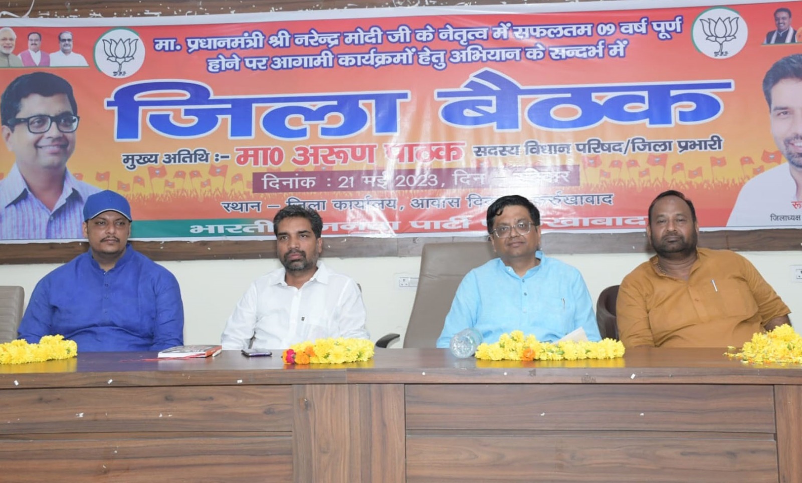 भाजपा जिला अध्यक्ष रूपेश गुप्ता ने बताया देश के प्रधानमंत्री नरेंद्र मोदी के नेतृत्व वाली केंद्र सरकार के सफलतम 9 वर्ष पूर्ण होने के उपलक्ष्य में प्रांतीय नेतृत्व ने आगामी कार्यक्रमों के माध्यम से लोकसभा विधानसभा एवं बूथ स्तर पर विभिन्न अभियानों को चलाने के निर्देश दिए हैं। जिसमें व्यापक जनसंपर्क लाभार्थी संपर्क समाज के विभिन्न वर्गों से संपर्क वरिष्ठ कार्यकर्ता संपर्क जैसे कार्यक्रम चलाए जाएंगे। जिसकी मॉनिटरिंग प्रांतीय व क्षेत्रीय नेतृत्व द्वारा की जाएगी। जिला अध्यक्ष ने बताया 3 जून को सांसद व प्रभारी मंत्री द्वारा केंद्र सरकार की उपलब्धियों पर प्रेस वार्ता का आयोजन होगा। 4 जून को कायमगंज में व्यापारी सम्मेलन आयोजित होगा। 11 जून को मोहम्मदाबाद में प्रबुद्ध वर्ग सम्मेलन आयोजित होगा। 16 जून को लोकसभा स्तर पर जनसभा का आयोजन होगा। 18 जून को नवाबगंज में सोशल मीडिया वॉलिंटियर सम्मेलन आयोजित होगा। विधानसभा स्तर पर वरिष्ठ कार्यकर्ता बैठक मोर्चा संयुक्त सम्मेलन लाभार्थी सम्मेलन एवं 21 जून को विश्व योग दिवस का आयोजन होगा। संचालन फतेह चंद वर्मा ने किया इस मौके पर एमएलसी प्रांशु दत्त द्विवेदी, डॉ रजनी सरीन, डॉ0 बीके गंगवार, कुलदीप गंगवार, अमर सिंह खटीक, हिमांशु गुप्ता, डीएस राठौर, सुनील रावत, शैलेंद्र सिंह राठौर, संजीव गुप्ता, शिवांग रस्तोगी, ठा0 वीरेंद्र सिंह राठौर, अभिषेक त्रिवेदी, अमरदीप दीक्षित, कुंवरजीत राजपूत, अभय कठेरिया बबिता पाठक, ममता सक्सेना रश्मि दुबे, सरिता शाक्य, राजकुमार वर्मा, विकास पांडे आदि मौजूद रहे।