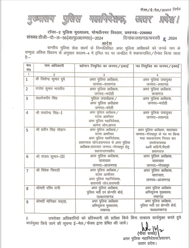 एएसपी कासगंज जितेंद्र कुमार दुबे को लखनऊ एएसपी, एएसपी भदोही राजेश कुमार को एएसपी कासगंज, एएसपी एवं पुलिस उपाधीक्षक बरेली डॉ0 तेजवीर सिंह को एएसपी भदोही, एएसपी एवं अपर पुलिस महानिदेशक आगरा जोन राघवेंद्र सिंह 1 को एडिशनल पुलिस उपायुक्त लखनऊ, एएसपी एवं अपर पुलिस महानिदेशक प्रयागराज जोन प्रयागराज से एएसपी यातायात गोरखपुर के लिए स्थानान्तराणीधीन प्रवीन सिंह चौहान को एएसपी यातायात गोरखपुर के पद पर किया गया, स्थानांतरण निरस्त कर उपसेनानायक 04वीं वाहिनी पीएसी प्रयागराज किया गया है के अलावा एएसपी यातायात आजमगढ़ संजय कुमार तृतीय को एएसपी यातायात गोरखपुर, एएसपी एवं अपर पुलिस महानिदेशक वाराणसी जोन विवेक त्रिपाठी को एएसपी यातायात आजमगढ़, एएसपी, पुलिस भर्ती एवं प्रोन्नति बोर्ड यूपी लखनऊ रश्मि रानी को एएसपी अभिसूचना मुख्यालय लखनऊ, एएसपी अभिसूचना मुख्यालय लखनऊ मोनिका चड्डा को एएसपी, पुलिस भर्ती एवं प्रोन्नति बोर्ड यूपी लखनऊ किया गया है।