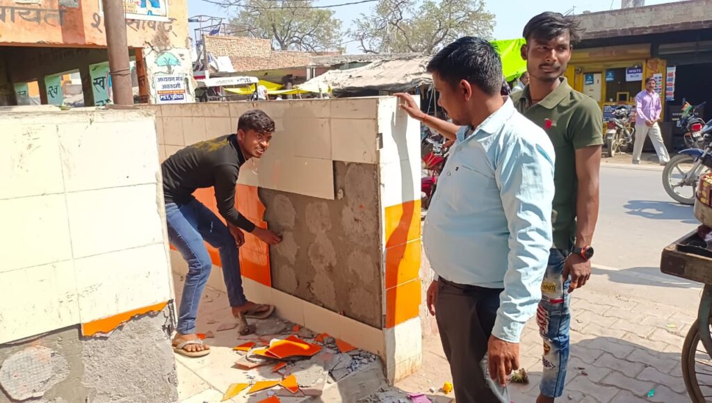 शौचालय में लगे भगवा टायल उखाड़ते नगर पंचायत कर्मचारी