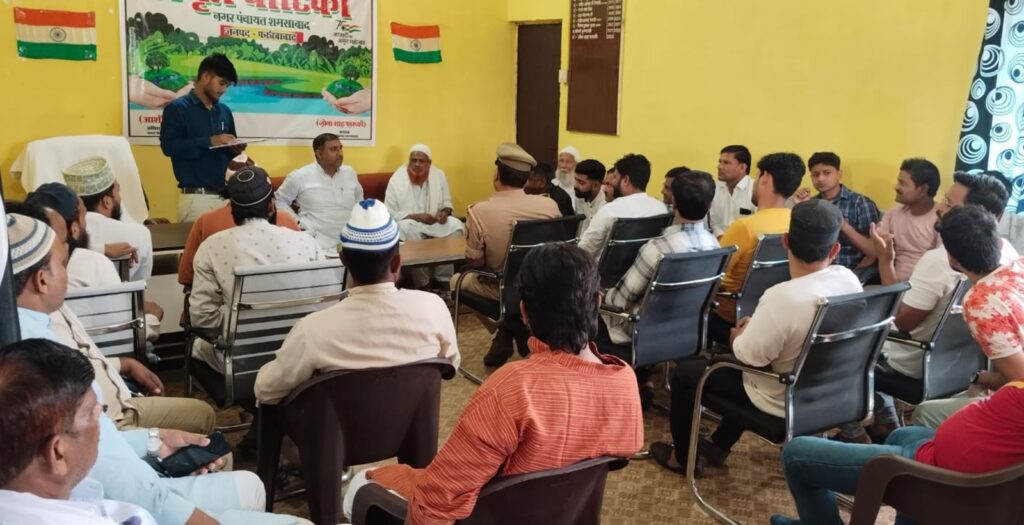 शमशाबाद. समृद्धि न्यूज। गणेश चतुर्दशी एवं बाराबफात के त्यौहार को लेकर नगर पंचायत अध्यक्ष की मौजूदगी में बैठक का आयोजन किया गया। जिसमें दोनों समुदाय के लोगों से शांतिपूर्ण माहौल में त्योहार मनाए जाने की अपील की गयी। जानकारी के अनुसार आगामी आने वाले गणेश चतुर्थी तथा बारावफात के पर्व को लेकर श्री सिद्धिविनायक कमेटी तथा सीरत कमेटी की संयुक्त बैठक नगर पंचायत कार्यालय शमशाबाद में अध्यक्ष की मौजूदगी में संपन्न हुई। बैठक में सभी धर्म के धर्म गुरुओं से शांति के माहौल में त्यौहार मनाए जाने की अपील की गई। बैठक यह भी कहा गया है इस बार बाराबरात तथा गणेश चतुर्थी का पर्व दोनों धर्म संप्रदाय के लोग मनाएंगे। उन्होंने दोनों धर्म सम्प्रदाय के लोगों से शांति के माहौल में पर्व मनाए जाने की अपील की। बैठक में नगर पंचायत अध्यक्ष एवं अध्यक्ष पति नदीम अहमद फारुकी, जोगराज राजपूत, दीपक श्रीवास्तव, मोनिस, हाफिज, नौशाद, साजिद सिद्दकी, रवि पांडे, अंकित राजपूत के अलावा सफाई नायक, लाइनमैन के अलावा ट्रैफिक पुलिस प्रशासन भी इस मौके पर मौजूद रहा। यह जानकारी मीडिया प्रभारी दीपक श्रीवास्तव ने दी।