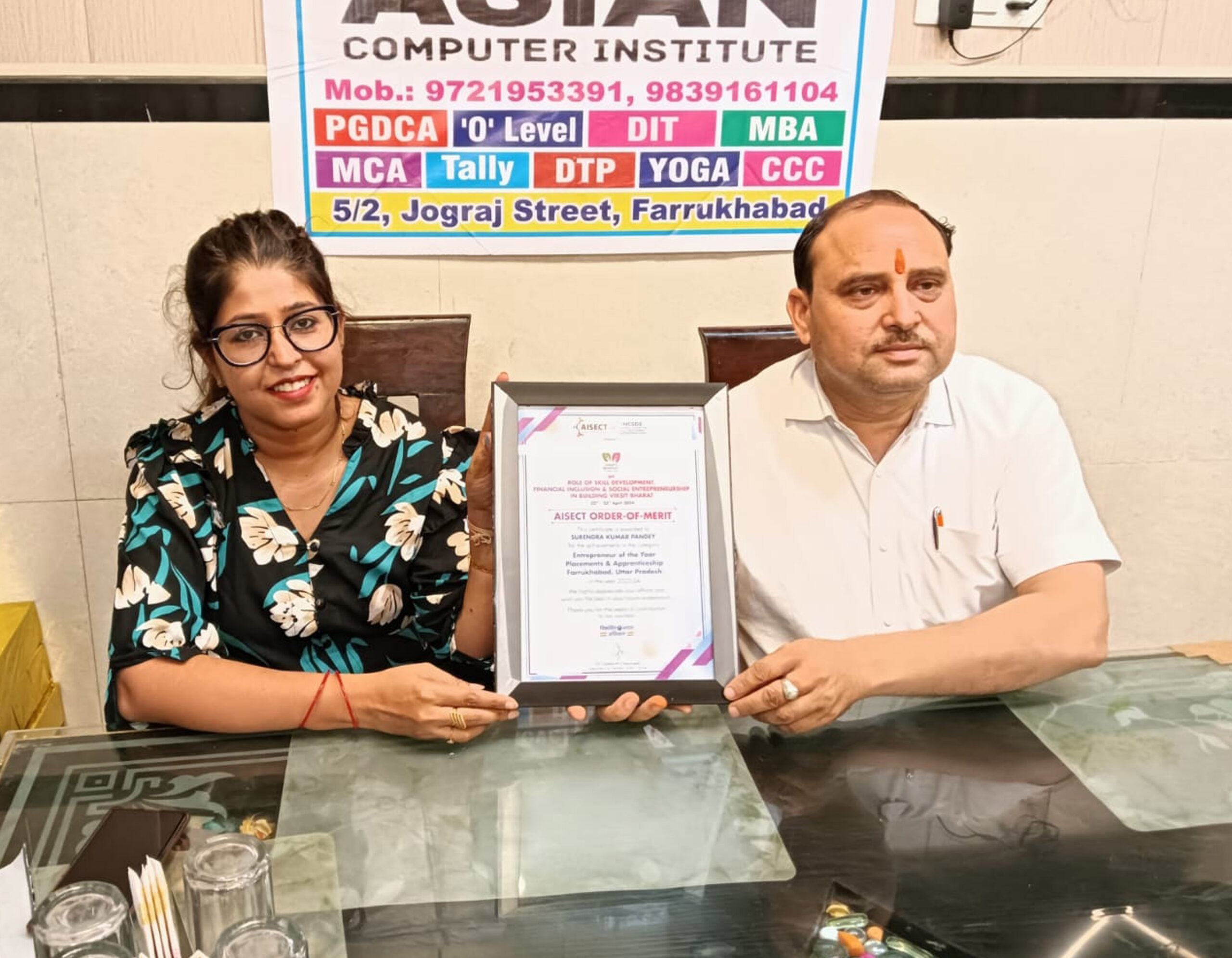 फर्रुखाबाद, समृद्धि न्यूज। विश्वनाथ सामाजिक सेवा संस्थान द्वारा संचालित आईसेक्ट के अधिकृत प्रशिक्षण केन्द्र एशियन कम्प्यूटर इंस्टीट्यूट को एक बार पुन: बेस्ट सेंटर अवार्ड से सम्मानित गया है।