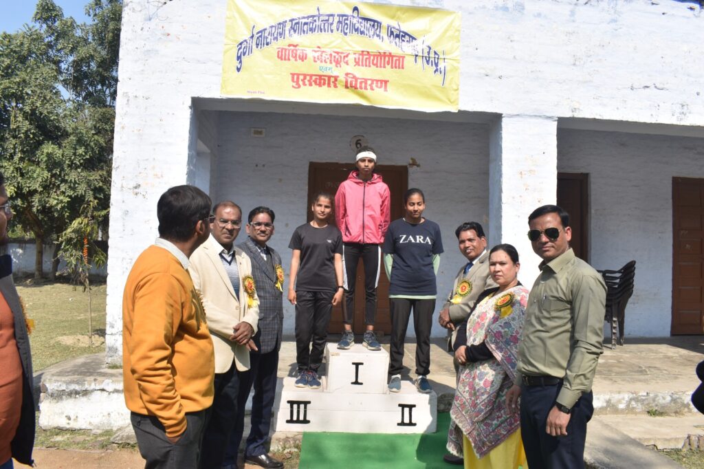 फर्रुखाबाद, समृद्धि न्यूज। दुर्गा नरायन महाविद्यालय की वार्षिक एथलेटिक्स प्रतियोगिता में आज अंतिम दिन 10,000 मीटर दौड़ में राजकमल, हैमर थ्रो में शैलेश चौहान,5,000 मीटर दौड़ में वीना यादव तथा ऊंची कूद में सचिन यादव व संध्या कटियार ने बाजी मारी। विजेताओं को मुख्य अतिथि बद्री विशाल डिग्री कालेज के प्राचार्य डॉ0 सी.डी. यादव ने पुरस्कृत किया।
