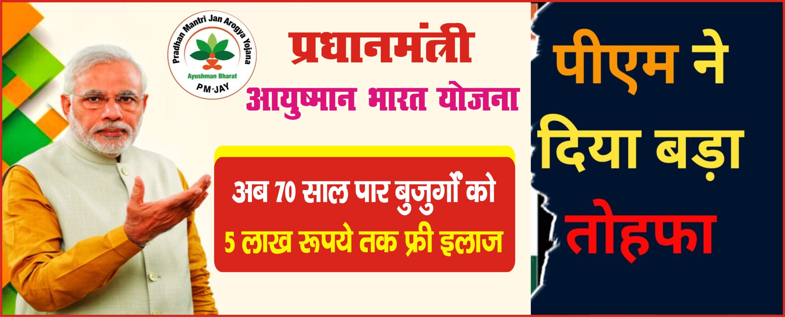 - आयुष्मान भारत पीएम जन आरोग्य योजना के तहत अब 70 साल से ऊपर के लोगों को भी मुफ्त इलाज दिया जाएगा. सरकार के मुताबिक, इस योजना के तहत 6 करोड़ सीनियर सिटिजंस को 5 लाख रुपए तक का इलाज मुफ्त में मिल सकेगा. इसके साथ ही उनको प्रति परिवार 5 लाख रुपये का फ्री हेल्थ इंश्योरेंस कवर भी दिया जाएगा.