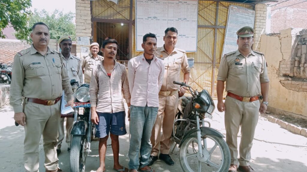 जानकारी के अनुसार थाना क्षेत्र के गांव कुतुबुद्दीनपुर में बीते दिनों एक युवक के घर के बरामदे से एक बुलेट मोटरसाइकिल चोरी हो गई थी। जिस पर पीडि़त ने पुलिस को तहरीर दी थी। पुलिस ने गांव कुतुबुद्दीनपुर निवासी ऋषभ उर्फ बाबा पुत्र जितेंद्र सिंह को तीन दिन पूर्व हिरासत में लेकर पूछताछ कर रही थी। नाम सामने आने पर पुलिस ने कोतवाली के एक गांव निवासी गजराज सिंह पुत्र केदार सिंह को हिरासत में ले लिया। जब उससे सख्ती से पूछताछ की। तो महत्वपूर्ण जानकारी मिली। गुरुवार को दोनों आरोपियों के पास से दो बाइक बरामद दिखाकर मुकदमा दर्ज कर जेल भेज दिया। वहीं हल्का इंचार्ज प्रमोद कुमार ने बताया कि दोनों बाइक चोर बाइक बेंचने का सौदा कर रहे है। जैसे ही जानकारी मिली तो मुखबर द्वारा बताये गये स्थान पर पहुंचकर घेराबंदी कर दोनों को पकड़ लिया। एक बुलट व एक स्प्लेंडर बाइक बरामद हुई। पुलिस ने मुकदमा दर्ज कर जेल भेज दिया।