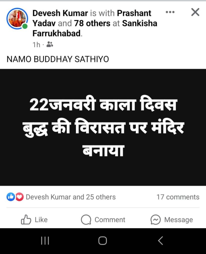 संकिसा, समृद्धि न्यूज। सोशल मीडिया पर बौद्ध धर्मी सहित दो लोगों को 22 जनवरी प्राण प्रतिष्ठा वाले दिन को काला दिवस बुद्ध की विरासत पर मंदिर बनाया आदि लिख कर वायरल करना काफी महंगा पड़ गया।