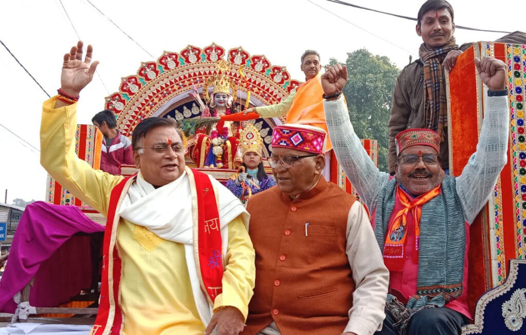 फर्रुखाबाद, समृद्धि न्यूज। मैं हूं राम पग-पग राम के तहत नगर में धूमधाम से 1008 राम स्वरुपों व 100 हनुमान स्वरुपों की शोभायात्रा निकाली गई। श्रीराम जन्मभूमि मंदिर प्राण प्रतिष्ठा समारोह समिति के द्वारा स्वराज कुटीर से शोभा यात्रा शुरु होकर लालगेट, घुमना, नेहरु रोड, चौक, रेलवे रोड होते स्टेट बैंक गली से घुमना मार्ग से वापस स्वराज कुटीर आयी। सभी रामस्वरुपों का स्वराज कुटीर में माल्यार्पण कर स्वागत किया गया। शोभा यात्रा में सांसद मुकेश राजपूत, विधायक सुशील शाक्य सहित लोगों ने प्रतिभाग किया।