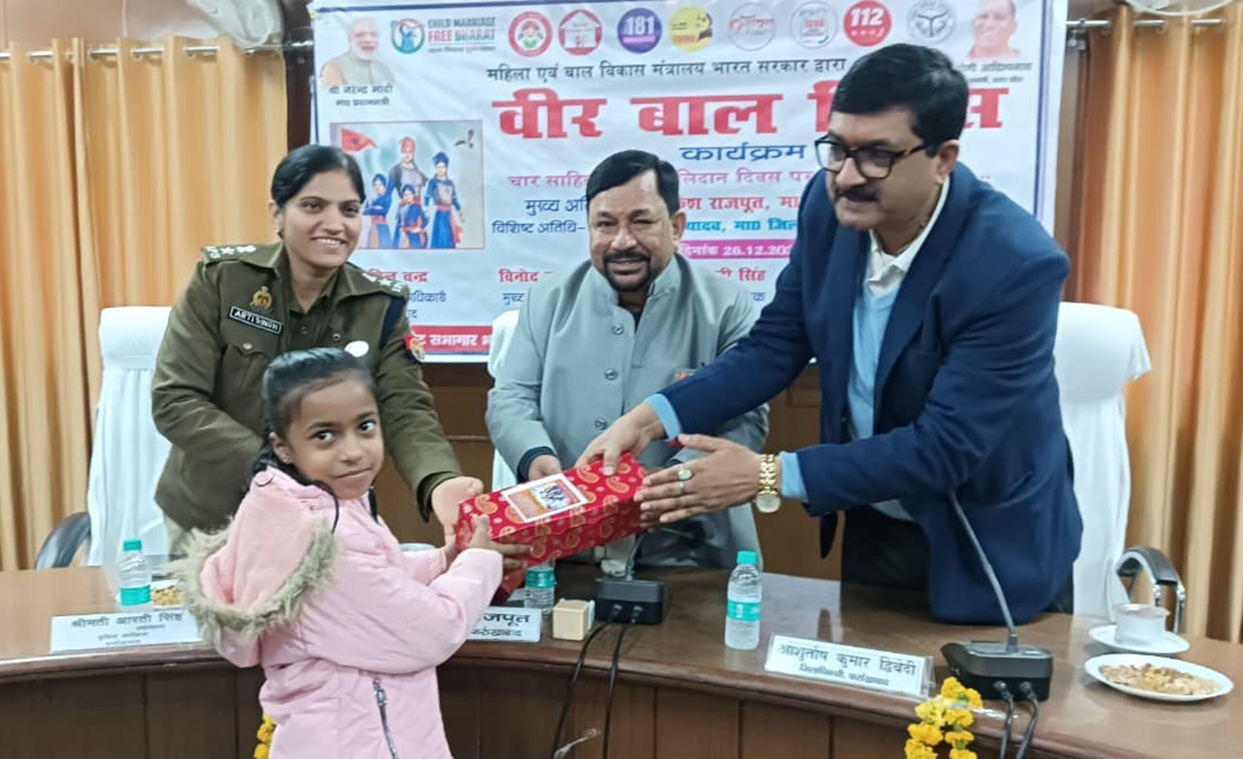 मुख्य अतिथि सांसद मुकेश राजपूत, जिलाधिकारी आशुतोष कुमार द्विवेदी, पुलिस अधीक्षक आरती सिंह, मुख्य विकास अधिकारी अरविंद कुमार गौड़, अपर पुलिस अधीक्षक अरुण कुमार सिंह तथा जिला विकास अधिकारी सुनील कुमार तिवारी ने वीर साहिबजादों के चित्र पर पुष्प अर्पित कर श्रद्धांजलि अर्पित की गई। कार्यक्रम का शुभारंभ जिला प्रोबेशन अधिकारी अनिल चंद्र ने अतिथियों के स्वागत एवं कार्यक्रम की संक्षिप्त रूपरेखा प्रस्तुत कर किया। सांसद मुकेश राजपूत ने गुरु गोविन्द सिंह के वीर सपूतों के जीवन पर प्रकाश डालते हुए बताया कि किस प्रकार उन्होंने धर्म की रक्षा हेतु अल्पायु में ही अपने प्राणों का बलिदान दे दिया तथा धर्मांतरण को अस्वीकार किया। उन्होंने कहा कि ऐसे असंख्य वीरों, माताओं, बहनों और बुजुर्गों के बलिदान से ही भारत राष्ट्र का निर्माण हुआ है। जिलाधिकारी आशुतोष कुमार द्विवेदी ने साहिबजादों के चमकौर युद्ध एवं उनके अद्वितीय साहस का उल्लेख करते हुए कहा कि देश और धर्म के प्रति समर्पण की भावना से प्रेरित होकर उन्होंने अपने प्राणों की आहुति दी। उन्होंने कहा कि यह बलिदान सदैव देशवासियों के हृदय में स्मरणीय रहेगा। कार्यक्रम के दौरान प्रधानमंत्री नरेंद्र मोदी द्वारा भारत मंडपम नई दिल्ली में आयोजित वीर बाल दिवस कार्यक्रम का सजीव प्रसारण भी देखा गया। सभी उपस्थितजनों द्वारा सामूहिक रूप से वंदे मातरम् का गायन किया गया। कक्षा 8 की छात्रा मानसी, मन्नत सिंह तथा कक्षा 12 की छात्रा आज्ञा मैविश, निहारिका दीक्षित, तान्या, स्नेहा गंगवार एवं किरण दुबे द्वारा वीर बाल दिवस के अवसर पर भाषण एवं गीत प्रस्तुत किए गए। वीर बाल दिवस सप्ताह के अंतर्गत माध्यमिक एवं बेसिक शिक्षा विभाग द्वारा आयोजित विभिन्न प्रतियोगिताओं में विजयी छात्र-छात्राओं, खेल प्रतियोगिताओं में उत्कृष्ट प्रदर्शन करने वाले प्रतिभागियों तथा ताइक्वांडो में गोल्ड व सिल्वर पदक प्राप्त करने वाली बेटियों को उपहार देकर सम्मानित किया गया। संचालन संरक्षण अधिकारी सचिन सिंह ने किया। इस अवसर पर परियोजना निदेशक कपिल कुमार, जिला विद्यालय निरीक्षक नरेन्द्र पाल सिंह, जिला कार्यक्रम अधिकारी सुनील कुमार श्रीवास्तव सहित जिला प्रोबेशन कार्यालय के समस्त कार्मिक उपस्थित रहे।