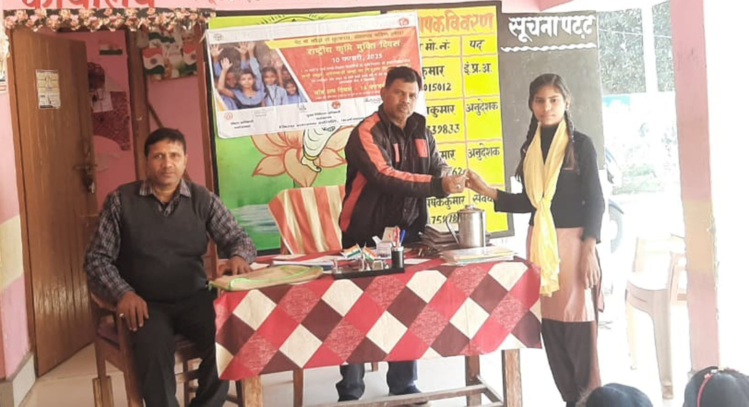 फर्रुखाबाद, समृद्धि न्यूज। राष्ट्रीय कृमि मुक्ति दिवस जन जागरुकता के साथ पूर्व माध्यमिक विद्यालय अमलैया आशानंद विकास खण्ड शमशाबाद में मनाया गया। इंचार्ज प्रधानाध्यापक व स्काउट मास्टर राजकुमार ने बताया कि पेट में कीड़े होने के कारण विभिन्न बीमारियां हो जाती है। प्रदूषित पानी, फल, सब्जी आदि को धोकर प्रयोग करें। नंगे पैर गंदे स्थानों का भ्रमण न करें। कीचड़ आदि में न खेलेे। पेट में कीड़े होने के लक्षण पेट में दर्द, होंटो पर सफेदी, शरीर का समुचित विकास न होना। मल की रास्ता में खुजली होना, आदि बीमारियों के लिए एल्बेंडाजोल टेबलेट है। जिसे अवश्य खाये। दो साल से बड़े बच्चे को पूरी टेबलेट और छोटे बच्चों को आधी टेबलेट गुनगुने व सादे पानी के साथ खाने के बाद या शाम को खिलाये। राष्ट्रीय कृति मुक्ति दिवस पर छात्र-छात्राओं को जागरुक किया गया। साथ ही प्रधानमंत्री का परीक्षा-पे चर्चा कार्यक्रम टीवी पर बच्चों को दिखाया गया। इस अवसर पर प्रधानपति प्रमोद गंगवार, एसएमसी अध्यक्ष अशोक कुमार, हरीश, अतुल कुमार, अभिषेक कुमार, निशा, सरला, बसंती, मुस्कान, सुंदरम, अंशुल, सत्यम, सेजल, शशि, नेहा, शालिनी, प्राची आदि मौजूद रहे।