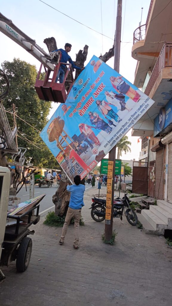 आचार संहिता लागू होते ही नगर पालिका परिषद कायमगंज द्वारा होर्डिंग व बैनर उतरने शुरु