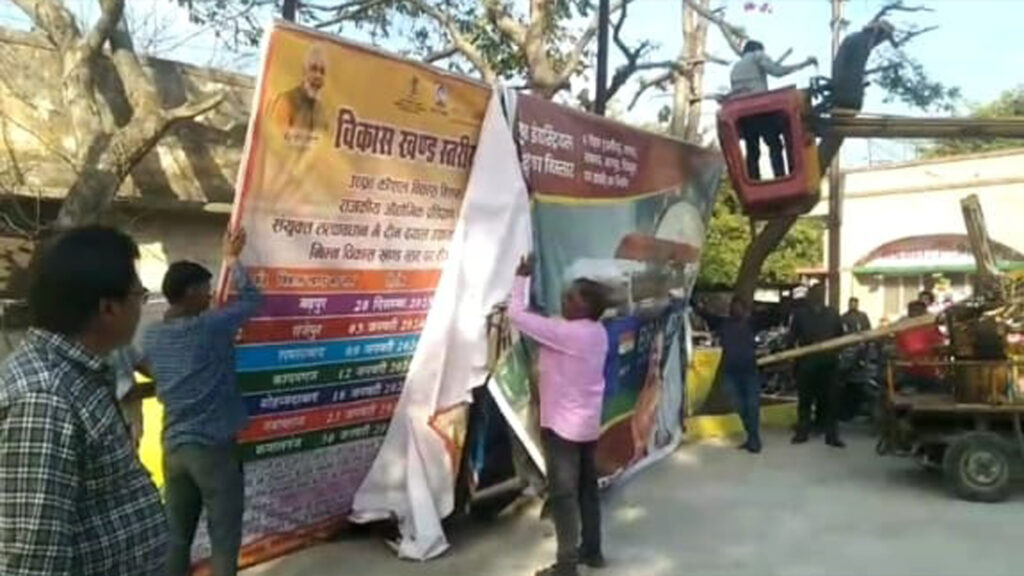 आचार संहिता लागू होते ही नगर पालिका परिषद कायमगंज द्वारा होर्डिंग व बैनर उतरने शुरु