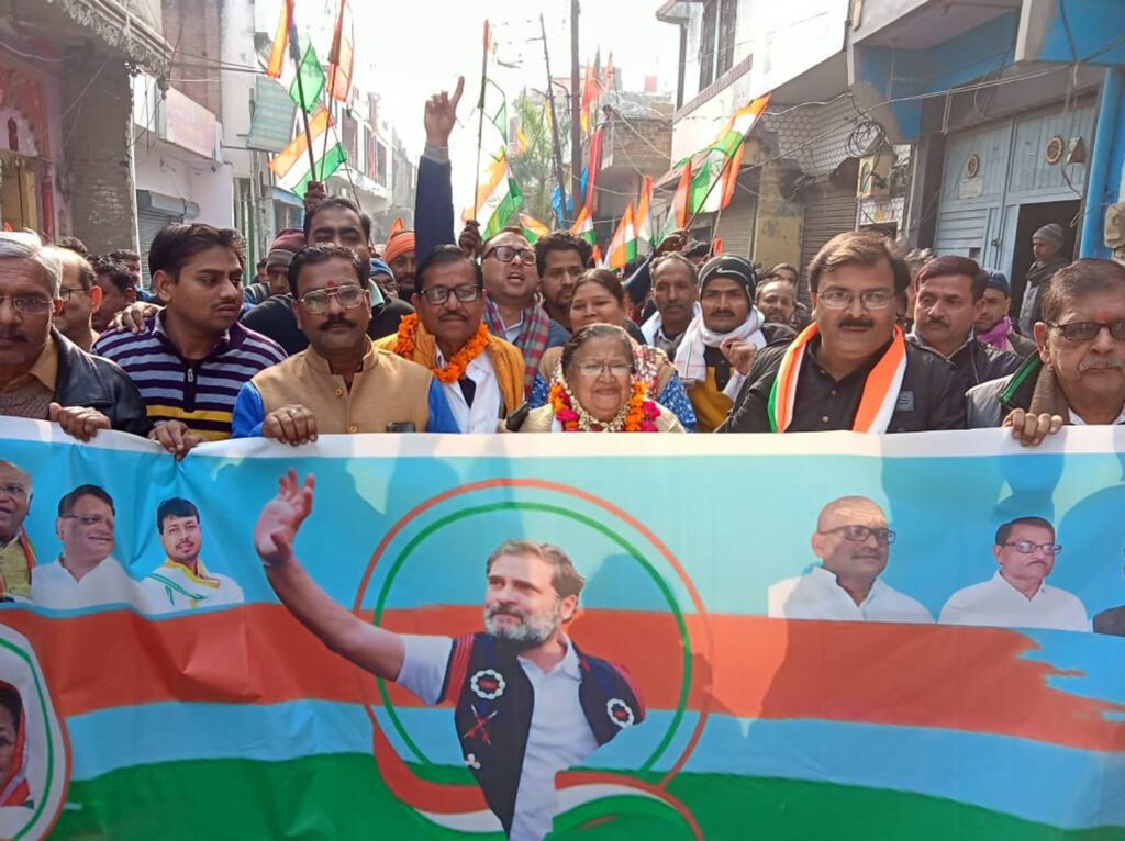 फर्रुखाबाद, समृद्धि न्यूज। राहुल गांधी के नेतृत्व में भारत जोड़ों न्याय यात्रा के समर्थन में मंगलवार को बजरिया स्थित डा0 पीएन सक्सेना के आवास से शहर के मुख्य मार्गों पर यात्रा निकाली गई। भारत जोड़ों न्याय यात्रा टाउन हाल पहुंचकर गांधी प्रतिमा पर माल्यार्पण कर रघुपति राजा राम गीत गाया गया।