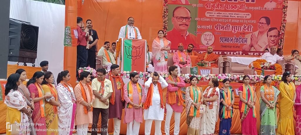 उपमुख्यमंत्री बृजेश पाठक ने कहा पहले बहन-बेटियां घर से बाहर निकलने से पहले डरती थी। बेटियों को गुंडे छेड़ते थे। आज एंटी रोमियों का गठन कर 25000 मुकदमें दर्ज कर गुंडो को सबको सबक सिखाया गया। आज अपराधी गले में पट्टी डालकर पहुंचते हैं और कहते हैं कि हम गुंडागर्दी नहीं करेंगे, हमें गिरफ्तार कर लो। आज मैं गर्व के साथ कह सकता हूं कि प्रदेश में कोई माफिया गिरोह नहीं है। सभी के नेटवर्क को ध्वस्त कर दिया गया है।माफियाओं के खिलाफ न्यायालय में पैरवी कर उन्हें लगातार सजा दिलाई जा रही है। मुख्यमंत्री योगी आदित्यनाथ के नेतृत्व में कानून का राज स्थापित हुआ है। इसीलिए मै आपके बीच आया हूं। बहराइच नगर पालिका को मॉडल के रुप में विकसित करने व केन्द्र और प्रदेश की सभी योजनाओं को धरातल पर उतारने के लिए भाजपा प्रत्याशी का जीतना जरुरी है।