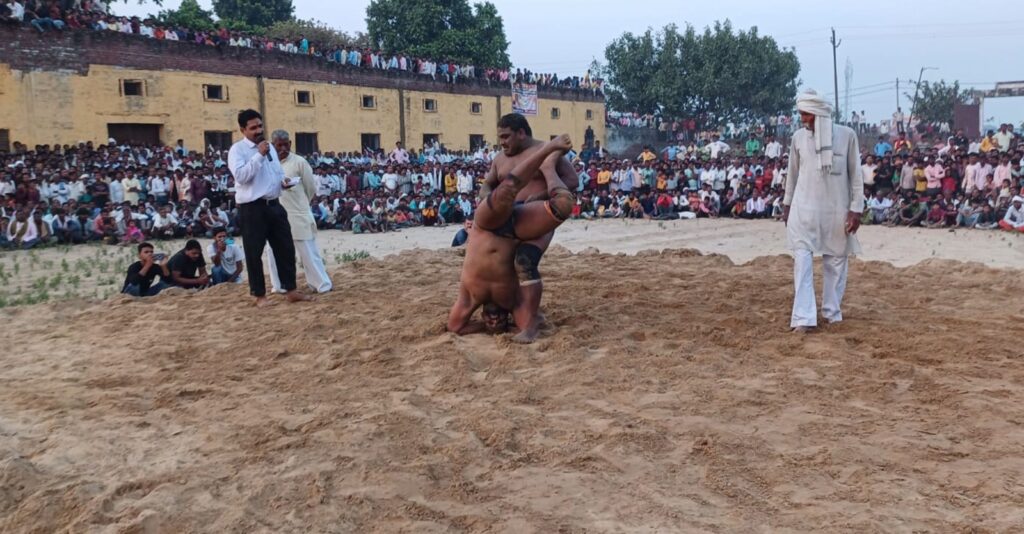 कंपिल, समृद्धि न्यूज। नगर में चल रहे रामलीला कमेटी के तत्वाधान में बुधवार को दंगल का आयोजन किया गया। जिसका शुभारंभ कार्यक्रम के मुख्य अतिथि समाजसेवी व प्रमुख उद्योगपति सत्यप्रकाश अग्रवाल, पुखराज डागा व पूर्व नगर पंचायत चेयरमैन उदयपाल सिंह ने पहलवानों का हाथ मिलवाकर किया। जिसमें विभिन्न क्षेत्रों से आए पहलवानों ने जमकर दांवपेंच दिखाए। बुधवार दोपहर को कंपिल कायमगंज मार्ग पर स्थित के0एस0आर0 इंटर कॉलेज के मैदान में रामलीला कमेटी के तत्वाधान में विराट दंगल का आयोजन किया गया। दंगल का संचालन पूर्व पहलवान कमेटी उपाध्यस्ख सौरभ मिश्रा व सुरेंद्र सैनी ने किया। सर्वप्रथम कुश्ती पहलवान हासिम अलीगढ़ व जिया सहावर के बीच हुयी। जिसमें जिया विजयी रहे। दूसरी कुश्ती नितिन पटियाली व विशाल कासगंज के हसन के बीच हुई। जिसमें पहलवान नितिन विजयी रहे। वही बदायूं के सोनू व पटियाली के नन्हें पहलवान के बीच कुश्ती हुई। कुश्ती बराबर रही। दूसरे सेले की कुश्ती श्यामवीर हाथरस व राजेश आगरा बहुत ही रोमांचक कुश्ती हुई स दूसरे सेले की कुश्ती बराबर छुट गयी। वही प्रथम सेले की कुश्ती मथुरा के मशहूर पहलवान रामेश्वर यादव व हरिओम मथुरा के बीच हुयी। हालांकि कुश्ती बराबर रही। विजेता उपविजेता पहलवानों को स्वेताम्बर तीर्थ कमेटी के मंत्री समाजसेवी पुखराज डागा ने पुरुस्कार देकर सम्मानित किया। पुरस्कार पाकर पहलावनों के चेहरे खिल उठे। दंगल को देखने के लिए हजारों की संख्या में दर्शक पहुंचे। ———–