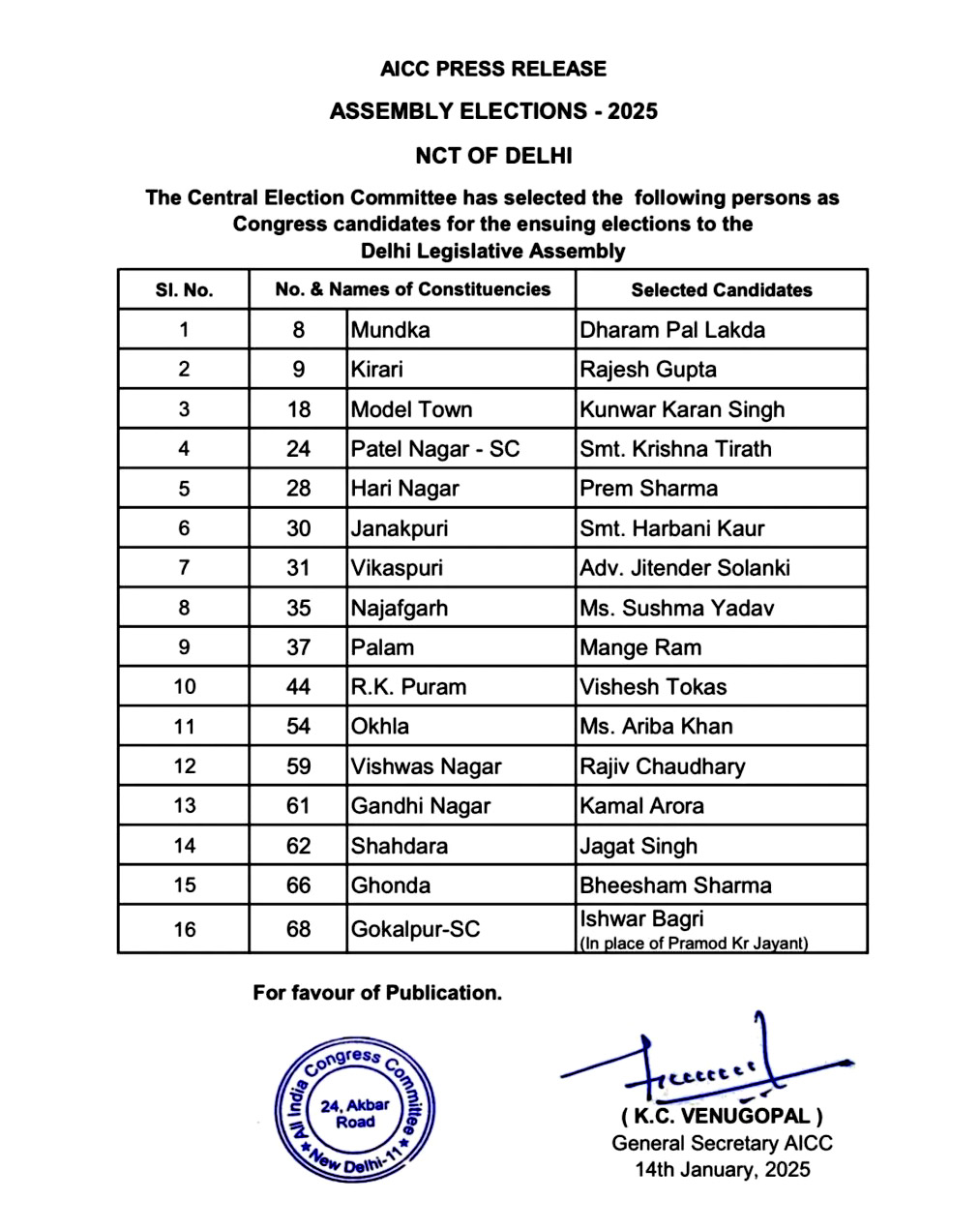 दिल्ली विधानसभा चुनाव के लिए कांग्रेस ने 16 उम्मीदवारों की सूची जारी की है। जिसमें मुडका विधानसक्षा क्षेत्र के लिए धरम पाल लाकड़ा और किराड़ी से राजेश गुप्ता, मॉडल टाउन से कुंवर करण सिंह को टिकट मिला है। दिल्ली विधानसभा चुनाव के लिए कांग्रेस ने उम्मीदवारों की एक और लिस्ट जारी कर दी है. इसमें 16 सीटों पर उम्मीदवारों के नाम का ऐलान किया है. कांग्रेस ने मुंडका सीट से धर्मपाल लाकड़ा और किराड़ी सीट से राजेश गुप्ता को टिकट दिया है. पालम विधानसभा सीट से कांग्रेस ने मांगे राम को उम्मीदवार बनाया है.