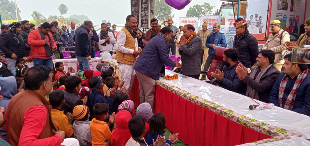 जिलाधिकारी द्वारा इस दौरान शपथ ग्रहण कराई गईं। जिलाधिकारी ने निर्देशित करते हुए कहा कि संबंधित विभागों द्वारा जनकल्याणकारी योजनाओं की जानकारी दी जाए। यदि कोई पात्र लाभार्थी किसी कारणवश वंचित रह गया है तो यात्रा कार्यक्रम में ही आवेदन कराकर योजनाओं का लाभ दिलाना सुनिश्चित किया जाए। विकसित भारत यात्रा में विधायक एवं जिलाधिकारी ने लाभार्थियों को घरौनी, आयुष्मान कार्ड वितरित किए। गर्भवती महिलाओं की गोद भराई के साथ-साथ नवजात शिशुओं को खीर खिलाकर अन्नप्राशन कराया। उपस्थित अधिकारियों द्वारा विभागीय योजना की जानकारी दी गई। कार्यक्रम में जिला विकास अधिकारी, जिला कार्यक्रम अधिकारी, उप निदेशक कृषि, उप मुख्य चिकित्सा अधिकारी, खंड विकास अधिकारी, जिला पंचायत सदस्य, ग्राम प्रधान, संबंधित अधिकारी एवं सम्मानित ग्रामीणजन आदि उपस्थित रहे।