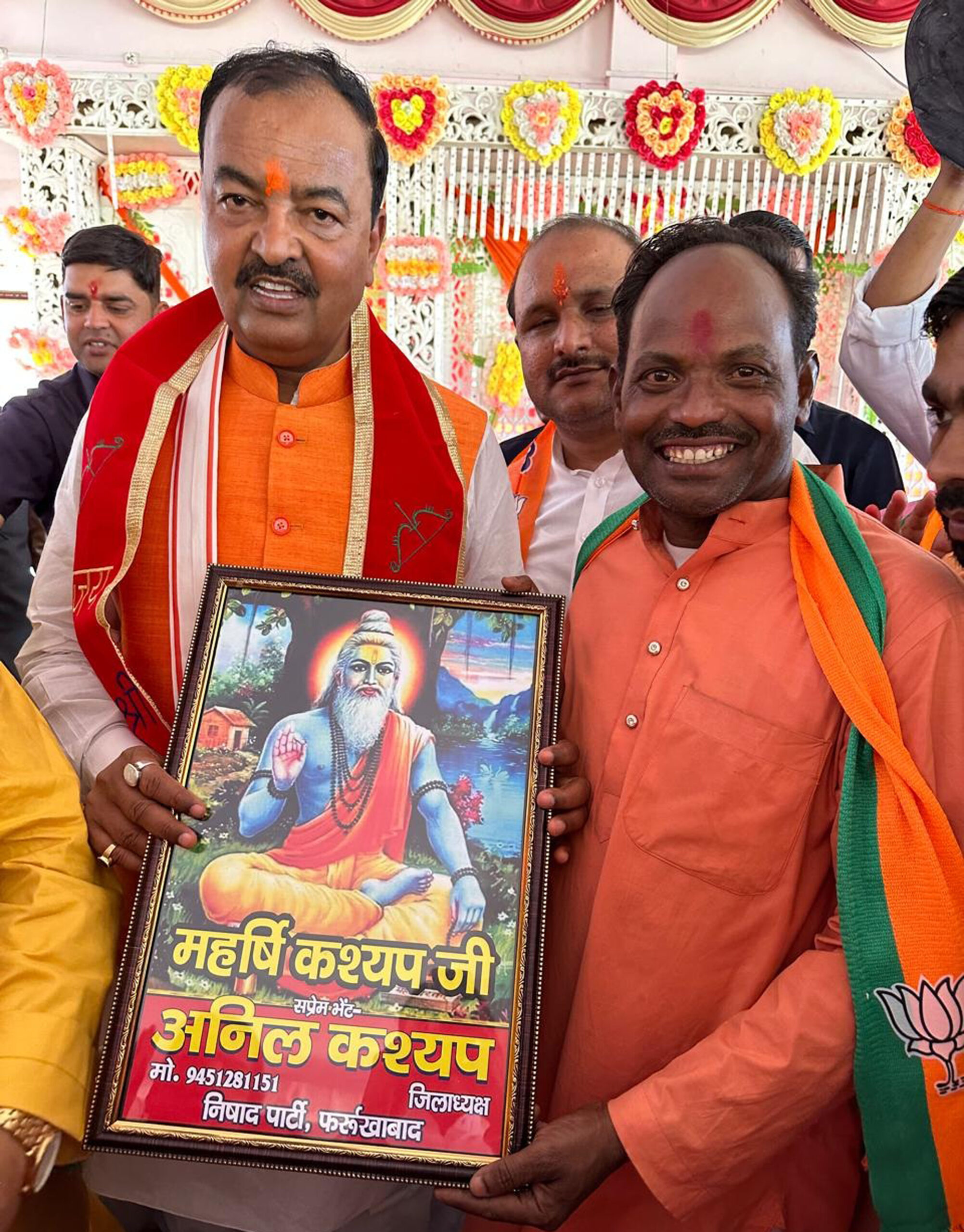 फर्रुखाबाद, समृद्धि न्यूज। निषाद पार्टी के जिलाध्यक्ष अनिल कश्यप ने उपमुख्यमंत्री केशव प्रसाद मौर्य को महर्षि कश्यप का चित्र देकर सम्मानित किया। गुरुगांव देवी मंदिर स्थित प्रांगण में बीते दिन आये प्रदेश के उपमुख्यमंत्री केशव प्रसाद मौर्य ने नामांकन सभा को सम्बोधित करते हुए सांसद मुकेश राजपूत को जिताने की अपील की। वहीं स्वागत के दौरान भाजपा जिलाध्यक्ष रुपेश गुप्ता ने निषाद पार्टी के जिलाध्यक्ष को मंच पर जगह दी। अनिल कश्यप ने मंच पर पहुंचकर केशव प्रसाद मौर्य को सम्मानित किया। केशव प्रसाद मौर्य की सभा में निषाद पार्टी के जिलाध्यक्ष अनिल कश्यप अपनी टीम के साथ कार्यक्रम में पहुंचकर भाग लिया।