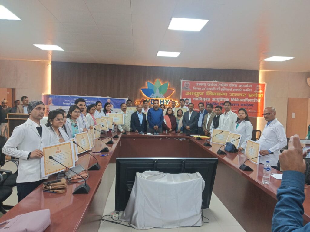 समृद्धि न्यूज़ अयोध्या। रविवार को अयोध्या मंडल के लोक सेवा आयोग द्वारा चयनित 19 आयुर्वेदिक चिकित्सक जिनका पुलिस वेरीफिकेशन और मेडिकल पूर्ण हो चुका है,को मंडल मुख्यालय के कमिश्नर मीटिंग हॉल में मंडलायुक्त गौरव दयाल व अपर आयुक्त प्रशासन अजय कांत सैनी द्वारा नियुक्ति पत्र का वितरण किया गया।उत्तर प्रदेश में आयुष विभाग द्वारा रिक्त पदों के सापेक्ष 391 चिकित्सकों को लोक सेवा आयोग की चयन प्रक्रिया के पश्चात आयुर्वेद चिकित्साधिकारी के पद पर चयनित किया गया है , कानपुर,लखनऊ मंडल तथा वाराणसी मंडल के चयनित चिकित्सा अधिकारियों के नियुक्ति पत्र का वितरण राजधानी स्थित लोक भवन में मुख्यमंत्री योगी आदित्यनाथ द्वारा किया गया और प्रदेश के अन्य जनपदों से चयनित चिकित्साधिकारियों के नियुक्ति पत्र का वितरण उनके गृह जनपद के मंडल मुख्यालय से किया गया।