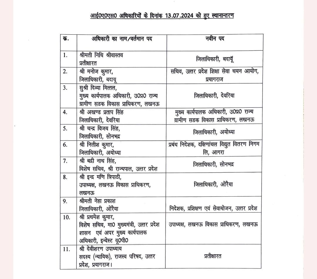 उत्तर प्रदेश में 11 आईएएस अफसरों के तबादले हुए हैं, यूपी में अयोध्या समते 5 जिलों के डीएम बदले गए हैं. चंद्र विजय सिंह को अब अयोध्या डीएम की जिम्मेदारी मिली है. वहीं इंद्रमणि त्रिपाठी डीएम औरैया की कमान संभालेंगे और बद्रीनाथ सिंह को डीएम सोनभद्र बनाया गया है. इसके अलावा दिव्या मित्तल को डीएम देवरिया और निधि श्रीवास्तव को डीएम बदायूं की जिम्मेदारी दी है. वहीं एमडी दक्षिणांचल विद्युत वितरण निगम की जिम्मेदारी नीतीश कुमार को मिली है.