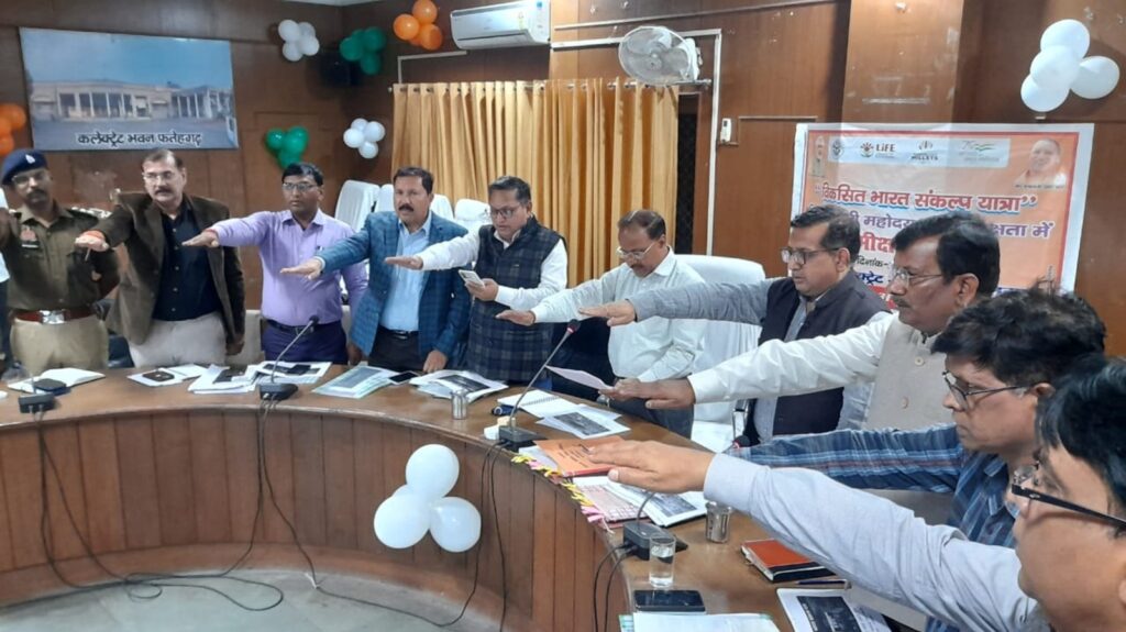 फर्रुखाबाद, समृद्धि न्यूज। जिलाधिकारी की अध्यक्षता में विकसित भारत संकल्प यात्रा के सम्बंध में कलेक्ट्रेट सभागार में बैठक संपन्न हुईं। बैठक मे जिलाधिकारी द्वारा उपस्थित समस्त अधिकारियों को शपथ ग्रहण कराईं गई। बैठक में बताया गया कि 22 नवंबर 2023 से 26 जनवरी 2024 तक विकसित भारत संकल्प यात्रा चलायी जाएगी। जिसमें सभी अधिकारियों, कर्मचारियों को पूरी ईमानदारी, लगन के साथ अपनी जिम्मेदारी को निभाकर सफल बनाना है। उक्त यात्रा के तहत जनपद की समस्त नगर पालिका, नगर पंचायत, ग्राम पंचायतों के जनसामान्य को प्रमुख जनकल्याणकारी योजनाओं के प्रति जागरूक कर संतृप्त करना है। जिन लाभार्थियों को योजनाओं का लाभ मिला है उनकी सफलता की कहानियों का भी प्रचार प्रसार करना है। जिन पात्र लाभार्थियों को योजनाओं का लाभ नहीं मिल रहा है उनको चिन्हित करना है। बैठक में मुख्य विकास अधिकारी, मुख्य चिकित्सा अधिकारी, उप निदेशक कृषि, सम्बंधित अधिकारी, कर्मचारी आदि उपस्थित रहे।