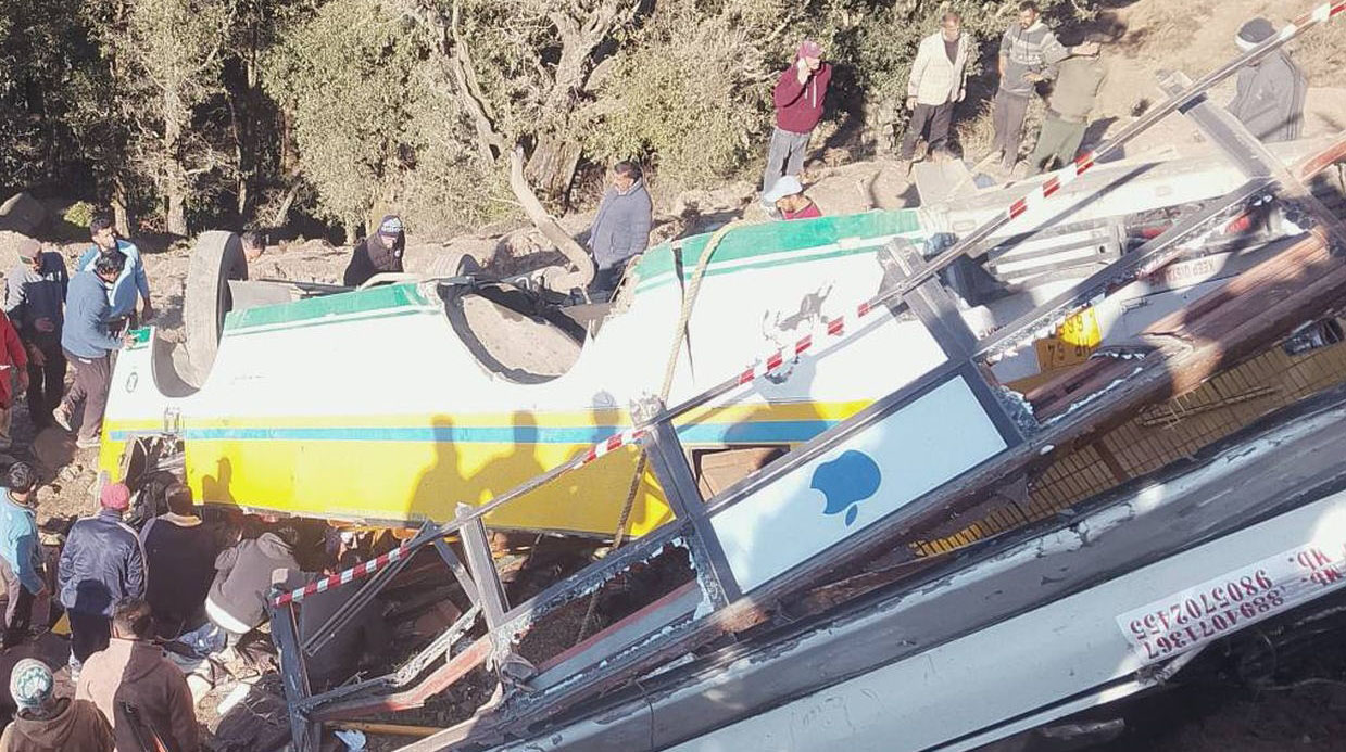 समृद्धि न्यूज। हिमाचल प्रदेश के सिरमौर जिले के हरिपुरधार में प्राइवेट बस हादसे का शिकार हुई है, जिसमें आठ लोगों की मौत हो गई है। शिमला से यह बस कुपवी जा रही थी और इस दौरान हरिपुरधार में हादसे का शिकार हो गई। स्थानीय लोग हादसे में घायलों को बाहर सडक़ तक लेकर आ रहे हैं। घटना के बाद मौके पर चिखों पुकार मची है। हादसा इतना भयानक था कि बस के परखच्चे उड़ गए हैं। मामले की गंभीरता को देखते हुए एसपी सिरमौर एनएस नेगी मौके के लिए रवाना हो गए हैं। उन्होंने बताया कि आठ के करीब लोगों के मौत की जानकारी मिली है। पुलिस मामले में बचाव कार्यों में जुट गई है। हरिपुरधार बाजार से ठीक पहले यह बस खाई में गिरी है, हालांकि, हादसे के पीछे की वजह पता नहीं चल पाई है। घटना के बाद लोगों की भीड़ मौके की तरफ भागी और लोगों को हादसे का शिकार बस से निकाला।