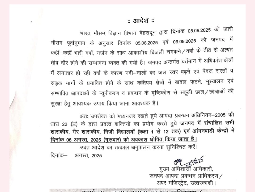 धराली में आपदा और मौसम विभाग के अलर्ट को देखते हुए कल बुधवार को उत्तरकाशी के विद्यालयों में अवकाश घोषित किया गया है।