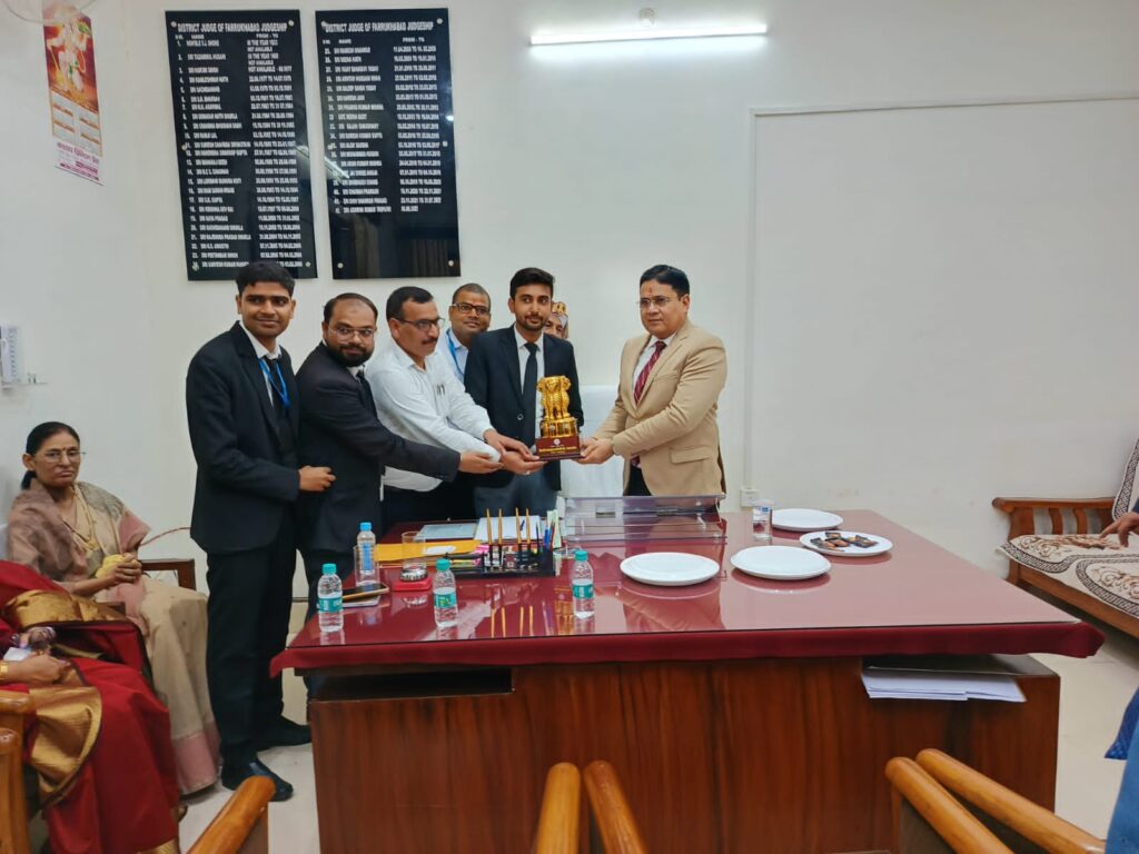 शनिवार को प्रशासनिक न्यायामूर्ति फर्रुखाबाद परिक्षेत्र डा0 योगेन्द्र कुमार श्रीवास्तव उच्च न्यायालय इलाहाबाद के जनपद आगमन पर उ0प्र0 दीवानी न्यायालय कर्मचारी संघ शाखा के जिलाध्यक्ष ऋषि यादव के नेतृत्व में कर्मचारी संघ के प्रतिनिधि मण्डल ने स्मृति चिन्ह भेंट कर शिष्टाचार मुलाकात की। इस अवसर पर प्रांतीय उपाध्यक्ष विवेक दत्त उपाध्याय, संरक्षक मो0 हाफिज सैफी, सचिव दिनेश गुप्ता, संगठन सचिव शिवम साहू आदि उपस्थित रहे।
