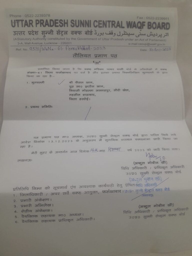 फर्रुखाबाद, समृद्धि न्यूज। उत्तर प्रदेश सुन्नी सेंट्रल वक्फ बोर्ड के अध्यक्ष ने वक्फ मस्जिद पत्थर वाली वाकिफ शेख महबूब हुसैन स्थित फतेहगढ़ वक्फ संख्या 61 के प्रबंध हेतु मोहम्मद अम्बर खान मुतवल्ली की तौलियत के कार्यकाल में बोर्ड के सदस्य के आदेश 15 दिसंबर 2022 तक संबंधित कार्यालय 16 दिसंबर 2022 को वक्फनामा की शरायत के खिलाफ होने के कारण वापस ले लिया गया है।