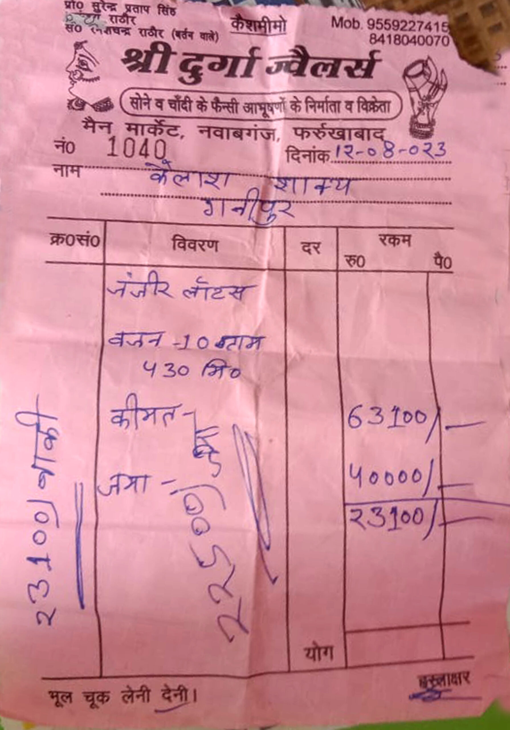 कस्बा नवाबगंज स्थित नया गनीपुर निवासी अंजू शाक्य पत्नी कैलाश चंद्र शाक्य ने थाना पुलिस को दी गयी तहरीर में बताया कि उसने बीते 12 अगस्त 2023 को सर्राफा व्यापारी श्री दुर्गा ज्वैलर्स के यहां से एक सोने की जंजीर खरीदी थी। जो 63000 की पड़ी थी, तभी अचानक उसे पैसे की जरुरत पड़ गयी। जिस पर उसने अपनी जंजीर नवाबगंज कस्बा के ही सर्राफा व्यापारी दिनेश ज्वेलर्स के यहां 35000 में गिरवी रख दी। पीडि़ता ने बताया कि उसने जंजीर में नाखूनी का निशान लगा दिया था। पीडि़ता जब दिनांक 12.11.2024 को ज्वैलर्स के यहां अपनी जंजीर छुड़ाने गयी। उसने ज्वैलर्स के बताये अनुसार ब्याज और मूलधन के सारे पैसे दुकानदारों को दे दिये और अपनी जंजीर मांगी, तो सर्राफा दुकानदार ने दूसरे दिन जंजीर देने की बात कही, लेकिन पीडि़ता के बताए दूसरे दिन भी जंजीर नहीं दी। पूरे दिन बैठने के बाद शाम को कह दिया कि सुबह जंजीर ले लेना आकर। जब पीडि़ता पुन: अगले दिन जंजीर लेने गई, तो ज्वैलर्स ने अपने यहां से जंजीर दी, लेकिन उसमें नाखूनी का निशान नहीं था। तब पीडि़ता को शक हुआ और उसने ज्वैलर्स से अपने नाखूनी का निशान लगी हुई जंजीर की मांग की, तो सर्राफा व्यापारी ने बताया की यही जंजीर तुम्हारी थी। जहां से बनवाई है वहां दिखाओ जाकर। जब पीडि़ता जंजीर दिखाने दुर्गा ज्वैलर्स के यहां गई, तो उन्होंने बताया कि यह जंजीर हमारी नहीं है। हमने जो जंजीर बनाई थी उस जंजीर में मोहर लगी हुई थी। यह जंजीर नकली है। यह सुन पीडि़ता के होश उड़ गए और पीडि़ता दोबारा गिंरवी गांठ रखने वाले व्यापारी के यहां गई और अपनी बात बताई। जिस पर दुकानदार एकदम आगबबूला हो गया और कहा कि यही जंजीर तुम्हारी थी। दूसरी जंजीर हम नहीं दे पाएंगे। तब पीडि़ता थाने पहुुंची और थाना पुलिस को अपने साथ घटी घटना की पूरी जानकारी एक तहरीर में लिखकर दी। तहरीर के आधार पर थाना अध्यक्ष विद्यासागर तिवारी के निर्देशन में कस्बा इंचार्ज दरोगा गिरीश चंद्र व्यापारी को थाने ले और पूरे दिन मामला चलता रहा, लेकिन कोई सुलह समझौता नहीं हो सका। पीडि़ता भी थाने बैठी थी और व्यापारी को भी पुलिस थाने में बैठाये हुए थी। दोनों तरफ से सिफारिश का दौर जारी था। वहीं थाना पुलिस ने बताया कि मामले की जांच पड़ताल चल रही है और पीडि़ता को न्याय दिलाया जाएगा, लेकिन अब यह देखने वाली बात है कि थाना पुलिस पीडि़ता को न्याय दिलाती है या फिर सर्राफा व्यापारी को। खबर लिखे जाने तक किसी भी पक्ष से कोई जानकारी प्राप्त नहीं हुई है। दोनों पक्ष थाने में बैठे हुए थे।