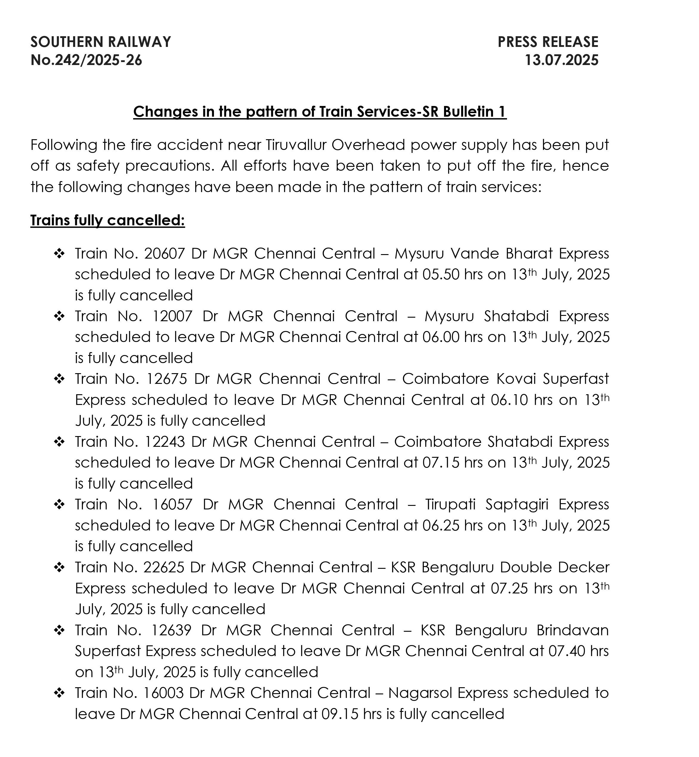साउदर्न रेलवे ने ट्वीट कर जानकारी दी है कि थिरुवल्लूर के पास हुई आग की घटना के चलते सुरक्षा के मद्देनजर ओवरहेड बिजली आपूर्ति बंद कर दी गई है, इससे ट्रेन संचालन में बदलाव किया गया है, यात्रियों को सलाह दी गई है कि वे यात्रा से पहले अपडेटेड स्टेटस जरूर चेक कर लें।