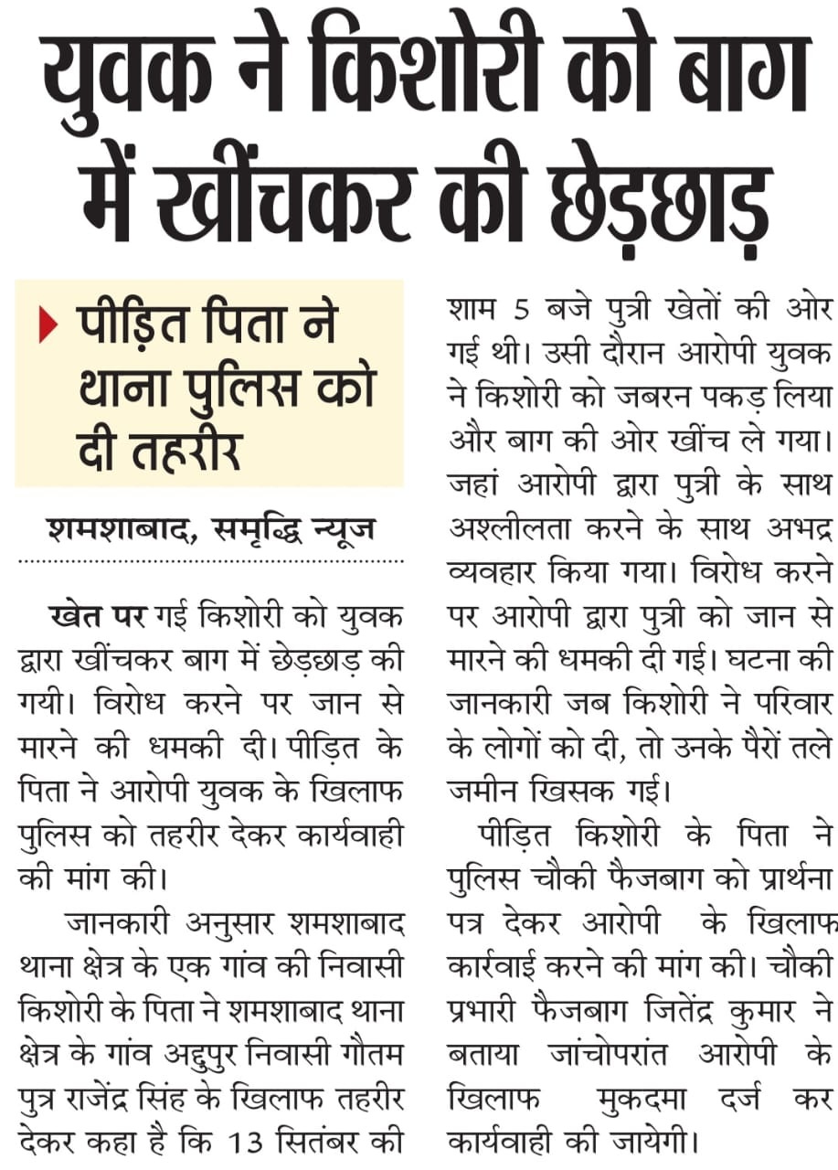 शमशाबाद, समृद्धि न्यूज। बीते दिनों छेड़छाड़ का शिकार हुई युवती की हत्या कर शव तालाब में फेंक दिया गया। घटना की जानकारी होने पर परिजनों में कोहराम मच गया। वहीं क्षेत्र में सनसनी फैल गई। मौके पर पहुंची पुलिस व फॉरेंसिक टीम ने जांच पड़ताल कर शव का पंचनामा भरकर पोस्टमार्टम के लिए भेजा।