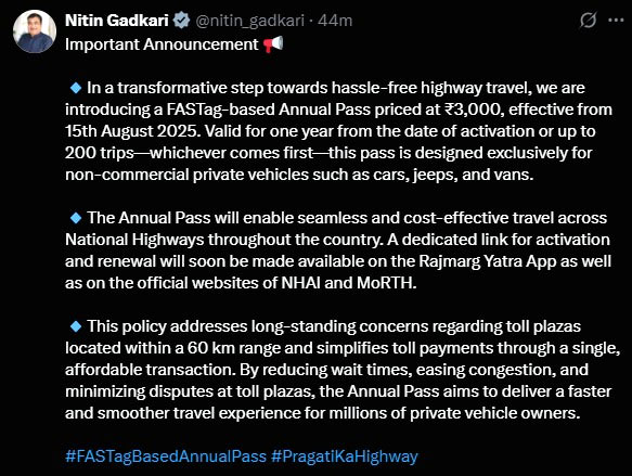 समृद्धि न्यूज। केंद्रीय मंत्री नितिन गडकरी ने बुधवार को कहा कि सरकार 15 अगस्त से निजी वाहनों के लिए 3,000 रुपये का फास्टैग आधारित वार्षिक पास शुरू करेगी। पास विशेष रूप से गैर-वाणिज्यिक निजी वाहनों के लिए तैयार किया गया है। सडक़ परिवहन और राजमार्ग मंत्री ने कहा कि वार्षिक पास पूरे देश में राष्ट्रीय राजमार्गों पर निर्बाध और लागत प्रभावी यात्रा प्रदान करने में मदद करेगा।