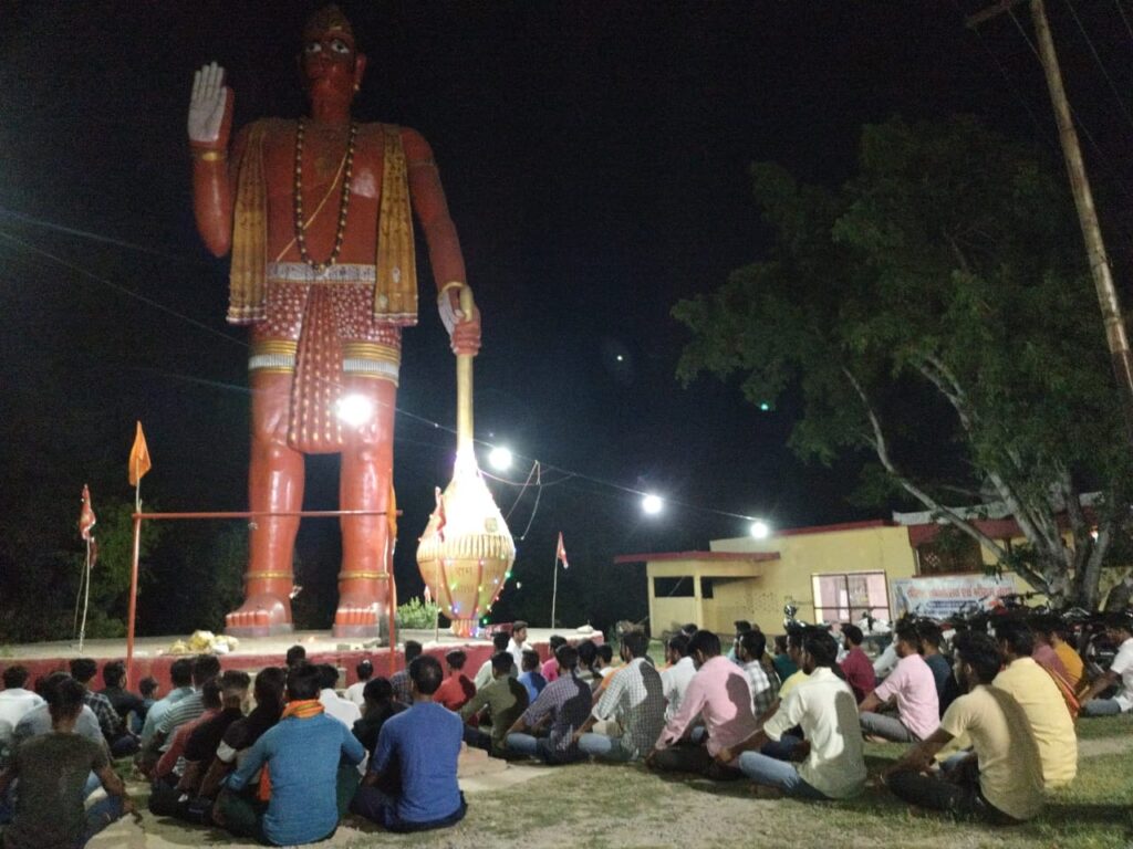 कस्बे में स्थित विशाल बाबा बजरंगबली की मूर्ति पर विश्व हिंदू परिषद बजरंग दल के कार्यकर्ताओं ने सप्ताहिक मिलन के दौरान हनुमान चालीसा का पाठ का बजरंगबली की महाआरती की।