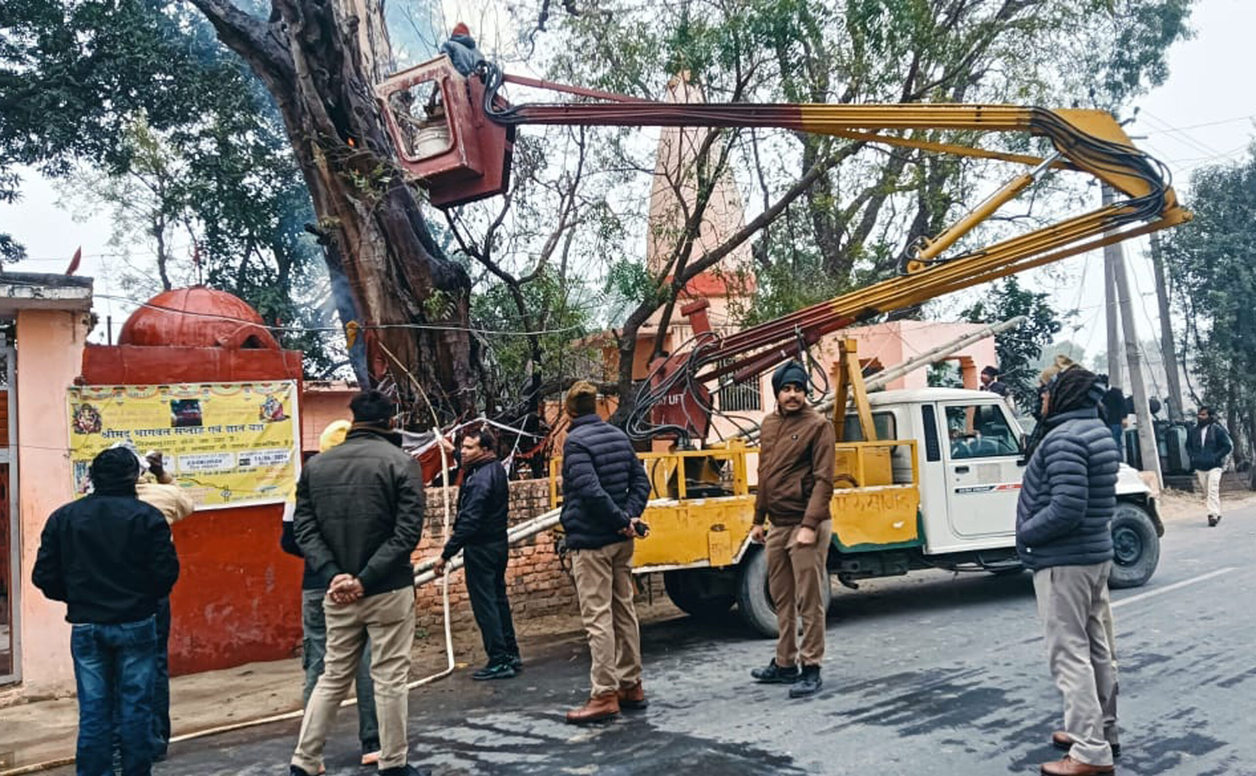 हाईटेंशन लाइन से मंदिर में खड़े विशाल पीपल के पेड़ में लगी आग