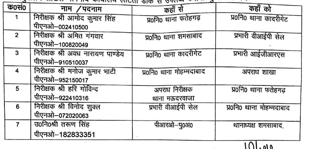 फतेहगढ़, कादरीगेट, मोहम्मदाबाद, शमशाबाद प्रभारी निरीक्षक बदले गये
