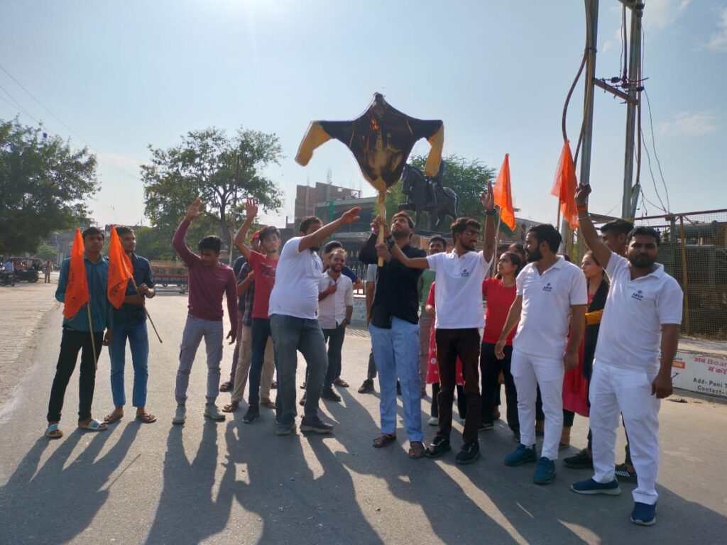 बहराइच समृद्धि न्यूज़ अखिल भारतीय विद्यार्थी परिषद बहराइच के कार्यकर्ताओं द्वारा चेपौक स्थित क्रिकेट स्टेडियम में राष्ट्रध्वज तिरंगे को कूड़ेदान में फेंकने की घटना के विरोध में महाराणा प्रताप चौक पर तमिलनाडु के मुख्यमंत्री व पुलिस प्रशासन का पुतला दहन किया। क्रिकेट मैच के दौरान दर्शकों से भारत के राष्ट्रीय ध्वज को डीएमके से संबंध अशोक सिगमनी के नेतृत्व में तमिलनाडु पुलिस तथा टीएनसीए द्वारा कूड़ेदान में फेकने का कृत्य भारतीय तिरंगे की गरिमा को अपमानित करने वाला है।डीएमके सरकार को इस कुत्सित कृत्य के लिए सार्वजनिक रूप से माफी मांगनी चाहिए तथा तमिलनाडु पुलिस के इस घटना में शामिल जवानों पर कड़ी दंडात्मक कार्रवाई सुनिश्चित कराई जानी चाहिए। तमिलनाडु पुलिस द्वारा किया गया भारतीय तिरंगे के प्रति यह अपमानजनक कृत्य पाकिस्तान में पूर्व में हुए भारतीय राष्ट्रीय ध्वज के अपमान जैसा प्रतीत होता है, यह अत्यंत दुर्भाग्यपूर्ण है कि आज ऐसा ही हमें अपनी भारतीय भूमि पर ही देखना पड़ा है। किसी भी राष्ट्र का राष्ट्रीय ध्वज उस राष्ट्र की संप्रभुता एवं स्वाभिमान का प्रतीक होता है। अतः कोई भी ऐसा कृत्य जो हमारी भारतीय भावनाओं को ठेस पहुंचाने वाला हो वह किसी भी दशा में स्वीकार्य नहीं है।अखिल भारतीय विद्यार्थी परिषद के प्रदेश सहमंत्री आदर्श शुक्ल ने कहा कि भारतीय राष्ट्रीय ध्वज के हुए अपमान को बिल्कुल भी सामान्य ढंग से नहीं लेना चाहिए। भारतीय तिरंगे का भारतीय भूमि पर इस तरह का अपमान बहुत शर्मनाक है। अखिल भारतीय विद्यार्थी परिषद भारतीय तिरंगे के पवित्रता एवं सम्मान को बनाए रखने के लिए कटिबद्ध है, हम सभी देशवासियों को यह सुनिश्चित करना होगा कि ऐसे कुत्सित कृत्यों से भारतीयता को ठेस न पहुंचे। अभाविप डीएमकेअ के पदाधिकारियों से इस कृत्य पर भारत के लोगों से माफी मांगने तथा तमिलनाडु पुलिस पर त्वरित रूप से दंडात्मक एवं विधिक कार्रवाई के लिए मांग करती है। अभाविप सभी नागरिकों से इस तरह के लोमहर्षक कृत्य से भारतीय भावना को न्याय दिलाने तथा भारतीय तिरंगे की पवित्रता को बचाने के लिए आह्वान करती है। इस मौके पर जिला संयोजक मंयक अग्रवाल, सहसंयोजक आशुतोष मिश्रा, नानपारा विस्तारक कुंज बिहारी शुक्ला, नगर मंत्री नित्या पाठक, कुलदीप सोनी, आराध्यधर द्विवेदी, शिवम, वंशिका मिश्रा, अंशिका वर्मा, रोशनी बानो, शशांक शुक्ला, मान सिंह यादव, तनिष्का सहित अन्य कार्यकर्ता उपस्थित रहे।