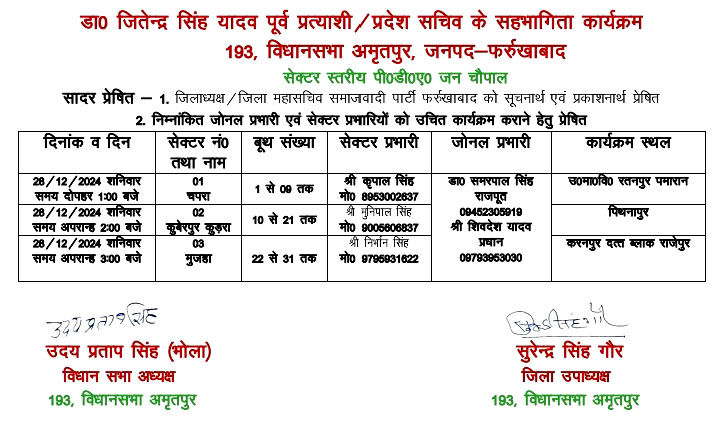 फर्रुखाबाद, समृद्धि न्यूज। समाजवादी पार्टी पीडीए जन चौपाल कार्यक्रम के लिए सेक्टर व जोनल प्रभारी नियुक्त कर कार्यक्रम कराया जा रहा है। इसी के तहत डॉ0 जितेंद्र सिंह यादव पूर्व प्रत्याशी प्रदेश सचिव समाजवादी पार्टी के सहभागिता कार्यक्रम 193 विधानसभा अमृतपुर में सेक्टर स्तरीय पीडीए जनचौपाल कार्यक्रम का आयोजन किया जा रहा है। जिला उपाध्यक्ष सुरेंद्र सिंह गौर व अमृतपुर विधानसभा अध्यक्ष उदयप्रताप भोला यादव द्वारा दी गयी जानकारी के अनुसार 28 दिसंबर दिन शनिवार को दोपहर 1 बजे सेक्टर चपरा बूथ संख्या-1 से 9 तक जिसके सेक्टर प्रभारी कृपाल सिंह व जोनल प्रभारी डॉ0 समरपाल सिंह राजपूत को बनाया गया है। यह कार्यक्रम उ0मा0वि0 रतनपुर पमारान में अपराह्न 1 बजे, सेक्टर कुबेरपुर कुड़ार बूथ संख्या- 10 से 21तक सेक्टर प्रभारी मुनिपाल सिंह, जोनल प्रभारी शिवदेश यादव कार्यक्रम स्थल पिथनापुर, सेक्टर-3 मुजहा बूथ संख्या 22 से 31 तक ३ बजे, सेक्टर प्रभारी निर्भान सिंह, जोनल प्रभारी शिवदेश यादव प्रधान व डा0 समरपाल सिंह राजपूत कार्यक्रम स्थल करनपुरदत्त ब्लाक राजेपुर में आयोजित होगा।