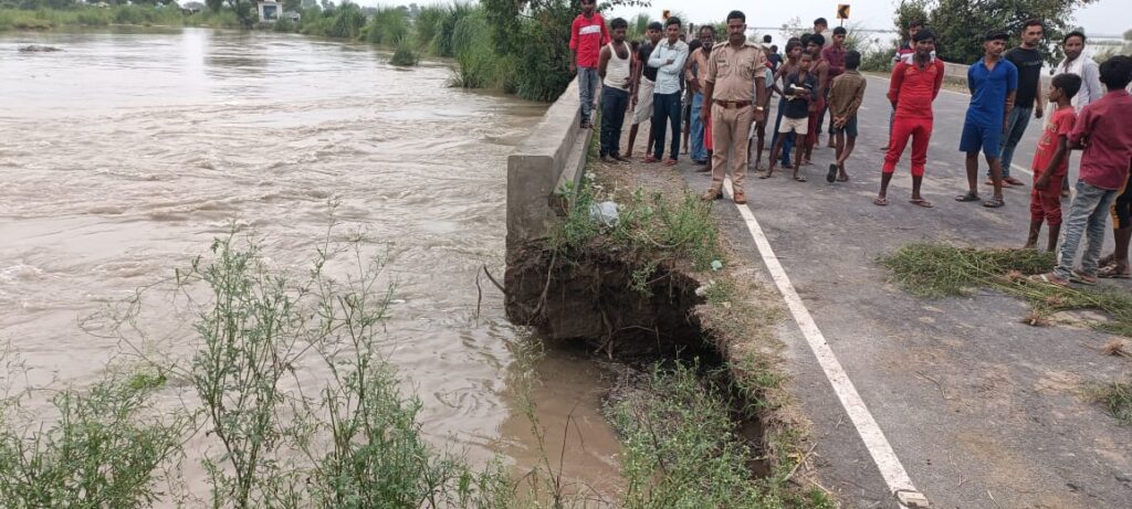 कंपिल बदायूं मार्ग पर स्थित गांव शेखपुर के निकट मुख्य मार्ग पर मौजूद पुलिया से सट कर बाढ़ के पानी ने नीचे नीचे कटान कर खोखला कर दिया है। जिस पर भारी वाहन के पहुंचते ही सडक़ धंसने से किसी बड़ी अनहोनी की संभावना के मद्देनजर आवागमन बंद कर दिया गया है। बाइक सवार व पैदल राहगीरों को एक एक कर सडक़ से निकाला जा रहा है। सडक़ के धंसते ही सडक़ में लगातार टक्कर मार रहा बाढ़ का पानी सडक़ के एक बड़े हिस्से को बहा ले जाएगा। सडक़ के कटते ही जिले का बदायूं जिले से संपर्क कट जाएगा फिर बदायूं, बरेली जाने के लिए फर्रुखाबाद या शमशाबाद से होकर जाना पड़ेगा। नायब तहसीलदार सनी कनौजिया ने बताया कि सडक़ के नीचे कटाव की सूचना मिली है, राजस्व कर्मियों को भेजकर सडक़ की जांच कर आवागमन रोक कर सडक़ दुरुस्त कराई जाएगी।