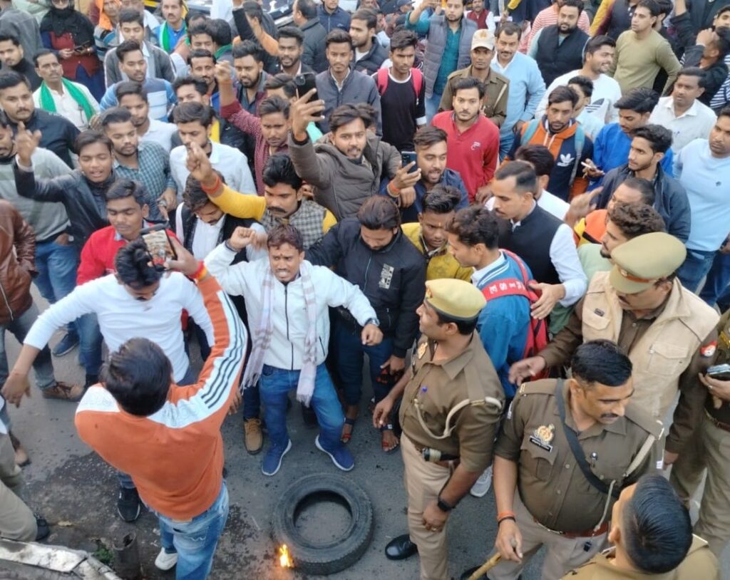 फर्रुखाबाद, समृद्धि न्यूज। राष्ट्रीय राजपूत करणी सेना के राष्ट्रीय अध्यक्ष की हत्या के विरोध में संगठन के पदाधिकारियों नें सडक़ पर प्रदर्शन कर हत्यारोपियों के एनकाउंटर की मांग की है। इस दौरान आक्रोशित भीड़ नें एक टायर में आग लगाकर नारेबाजी की, लेकिन पुलिस नें जलता हुआ टायर छीन लिया, लेकिन टायर की आग से एक प्रदर्शन करनें वाले युवक का हाथ झुलस गया।