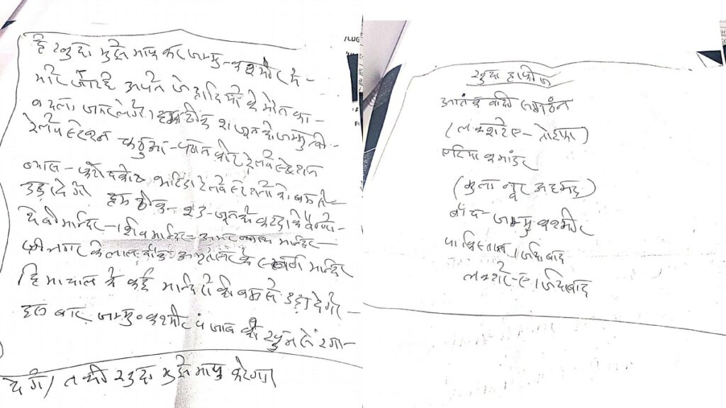 धमकी के खत के मुताबिक पंजाब का गोल्डन टेम्पल, वैष्णो देवी मंदिर और अमरनाथ यात्रा आतंकियों के निशाने पर है. खत के मुताबिक जम्मू कश्मीर के कई रेलवे स्टेशन भी आतंकियों के निशाने पर है. खत में लिखा गया है कि ‘हे खुदा मुझे माफ़ कर… जम्मू कश्मीर में अपने जिहादियों की मौत का बदला जरूर लेंगे.
