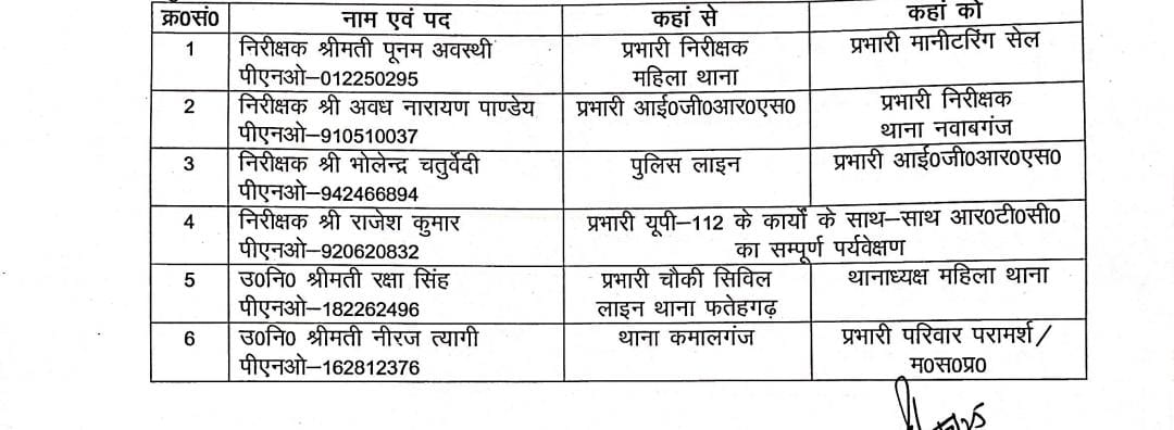 • कमालगंज थाने की उपनिरीक्षक नीरज त्यागी को परिवार परामर्श एवं महिला सहायता प्रकोष्ठ का प्रभारी बनाया गया।