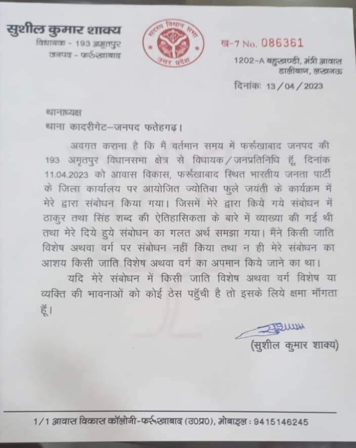 फर्रुखाबाद, समृद्धि न्यूज। बीते दिन विधायक सुशील शाक्य का ब्यान विवादों में आया। जिसको लेकर उन्होंने अपने निवास पर पत्रकार वार्ता में कहा कि ज्योतिबा वाई फुले जयंती कार्यक्रम पार्टी कार्यालय संबोधन के दौरान उन्होंने सिंह और ठाकुर शब्द का इस्तेमाल किया कि यह किसी की बपौती नहीं है। सिंह कोई भी लिख सकता है। वीडियो वायरल होने पर चौतरफा क्षत्रिय समाज की ओर से विरोध शुरु हो गया। गुरुवार को उन्होंने अपने आवास पर वार्ता के दौरान कहा कि मैंने कार्यक्रम के दौरान अपने सम्बोधन में कुछ भी नहीं कहा जो किसी जाति विशेष को ठेस पहुंचाये। यदि फिर भी किसी को ेऐसा लगता है कि मेरे द्वारा कही गयी बात से ठेसे पहुंची है तो मैं अपने शब्द वापस लेता हूॅ। उन्होंने कहा कि 1931 में अंग्रेजो द्वारा सर्वेक्षण कराया गया था, तभी पिछड़ों व अति कमजोर वर्ग के लोगों को बांटने का काम किया गया था। मैंने ऐसा कुछ भी नहीं कहा जिससे किसी को ठेस पहुंचे और जो लोग विरोध जता रहे हैं वह बात को तोड़ मरोड़कर लोगों को बता रहे हैं। वार्ता के दौरान शिवांग रस्तोगी मौजूद रहे।
